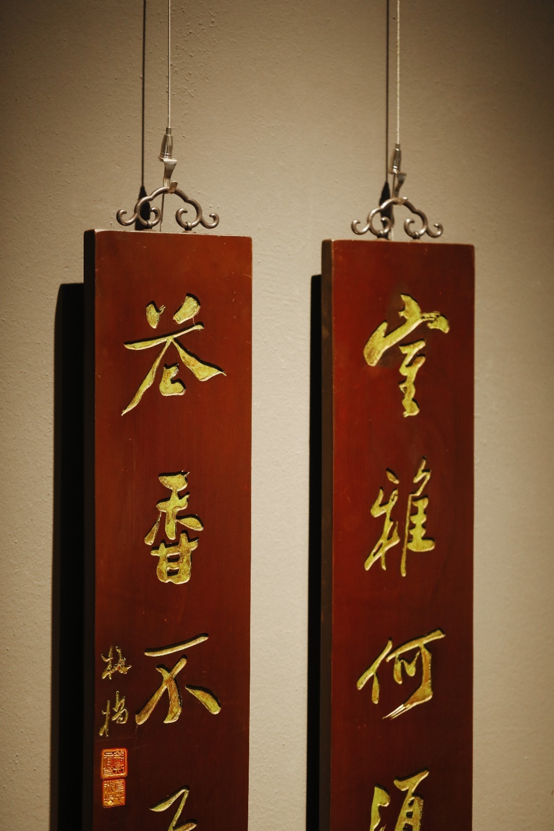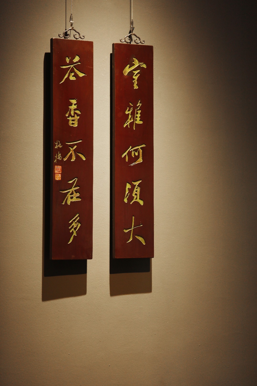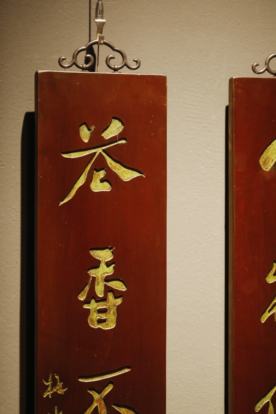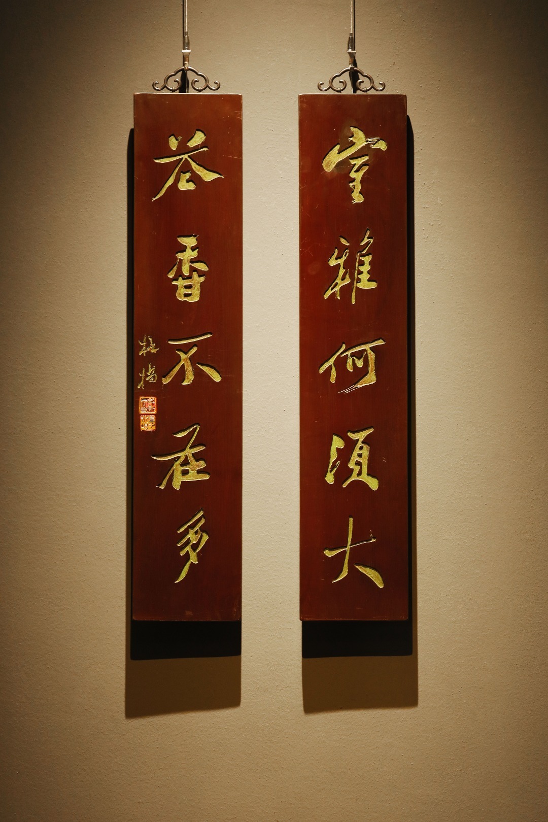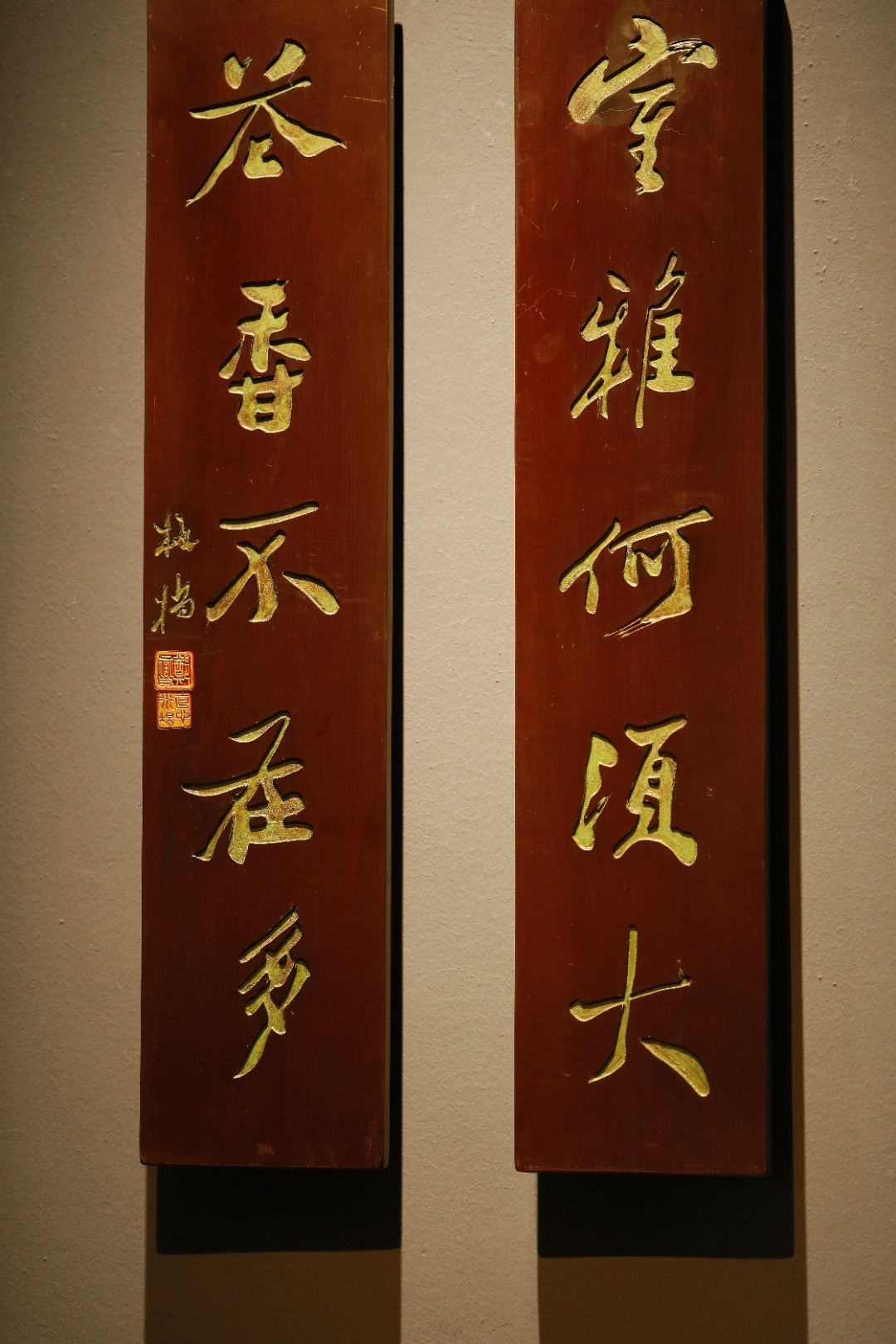 板桥 楠木 | 对联老木板平刻,矿彩漆绘,题识“室雅何须大,茶香不在多”,文人空