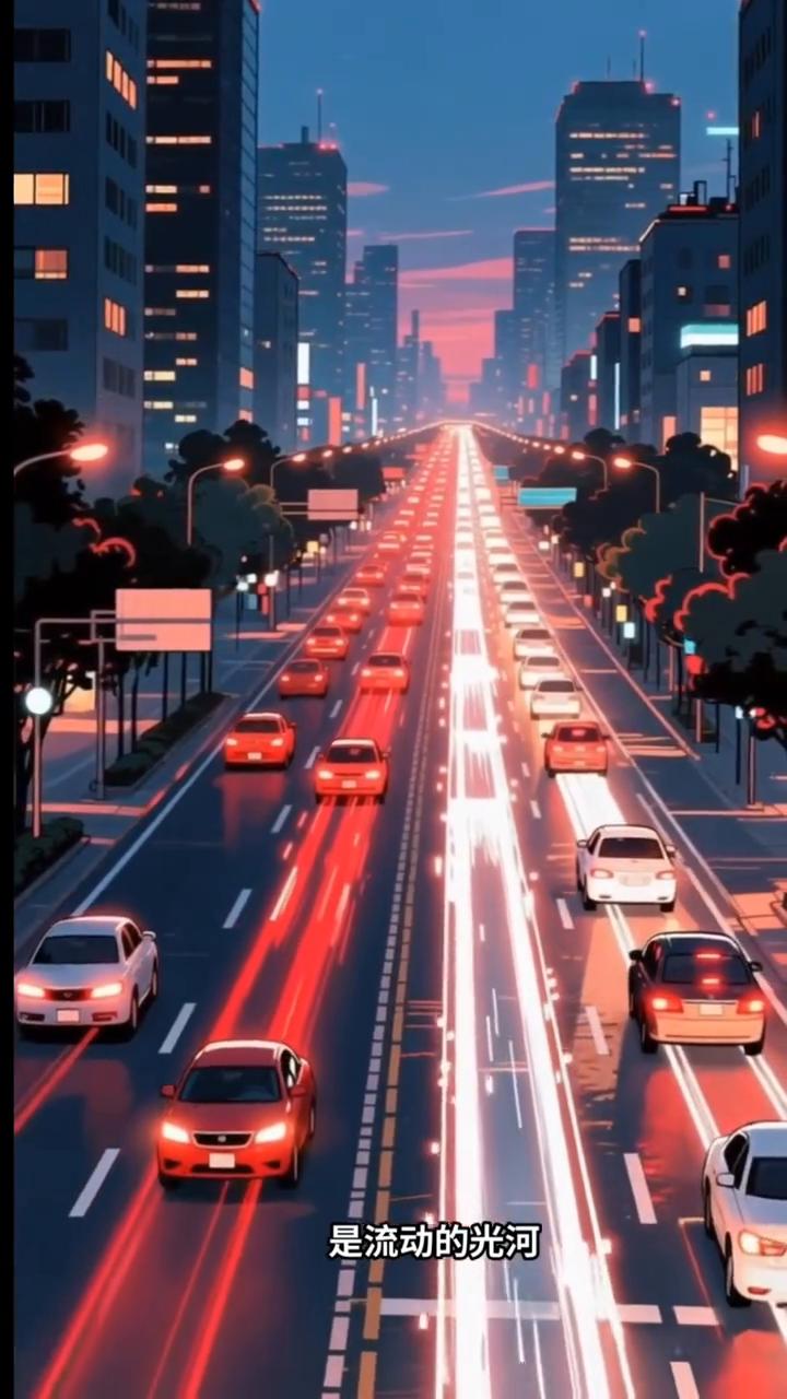 夜幕像一块深蓝色的丝绒,温柔地覆盖了大地,城市的中心。一场盛大的庆典正推向高潮,无数盏华灯骤然点亮,瞬间将黑夜照得如同白昼。 ·首先是远处建筑群轮廓线的金色灯带,像给摩天大楼镶上了耀眼的皇冠,一笔一划勾勒出都市的宏伟轮廓。 ·紧接着,无数霓虹灯牌在街巷间闪烁,红的热烈、蓝的静谧、紫的梦幻,每一个字符都跳动着鲜活的生命力。 ·而最动人的是流动的光河,马路上车流如织,红色的尾灯与白色的车头灯交织成长长的光带,由近及远,永不停歇地流淌着,像是一条发光的银河坠入了凡间。 ·空中绚烂的烟花轰然绽放,金红色的流星雨倾泻而下,短暂却极致辉煌,将每个人的笑脸映得通红。 ·在广场的喷泉旁,水柱随着音乐的节奏高低起伏,每一股水流上都映射着七彩的激光,仿佛无数道彩虹在舞动,空气里弥漫着爆米花的香甜和人群的欢笑。 每一束光都在追逐着另一束光,目之所及皆是璀璨与热烈。