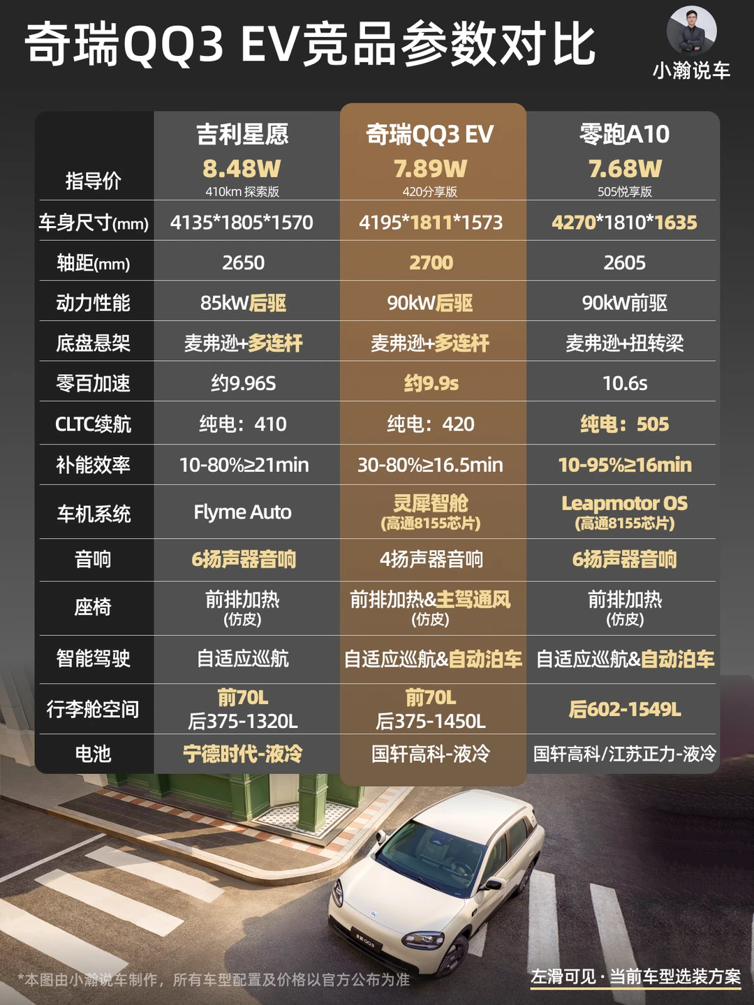 而如果横向对比其他10万以内的小车,QQ3是目前除了星愿外第二个带“后驱+前后独立悬挂”的车型。除了电池不是宁德时代(国轩高科虽不是一线,但品质尚可)外,整体配置和性价比优于现款星愿。而另一个竞争对手——上周掀桌子的零跑A10纸面实力上还是优于QQ3的。不过如果你对后驱带来的驾驶感和额外的前备箱有青睐,QQ3还是非常值得考虑的一个选择。