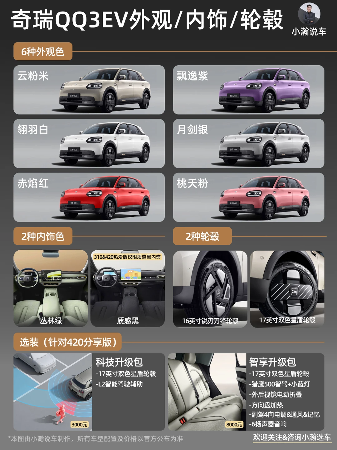 对于家里有其他车开、具备家充条件、且预算确实紧张的用户,可以考虑不到6万拿下310热爱版,整体的用车体验和安全性会比宏光MINI那类的微型车好不少。当然如果预算不吃紧,小瀚推荐一步到位直接上420分享版,并根据用车需求选装猎鹰500智驾。