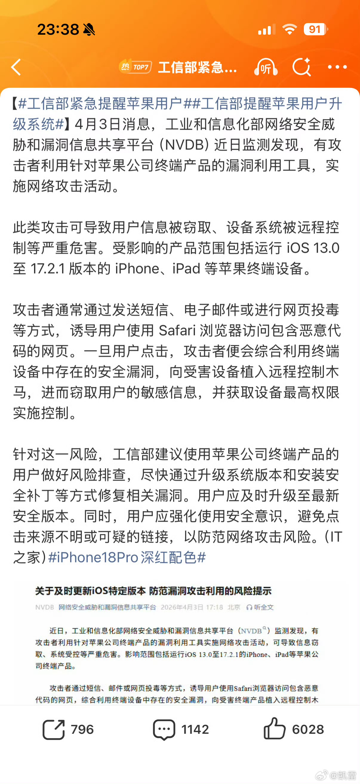 工信部紧急提醒苹果用户工信部提醒苹果用户升级系统 天,谢谢工信部,我的iphone7plus也正遭受攻击!