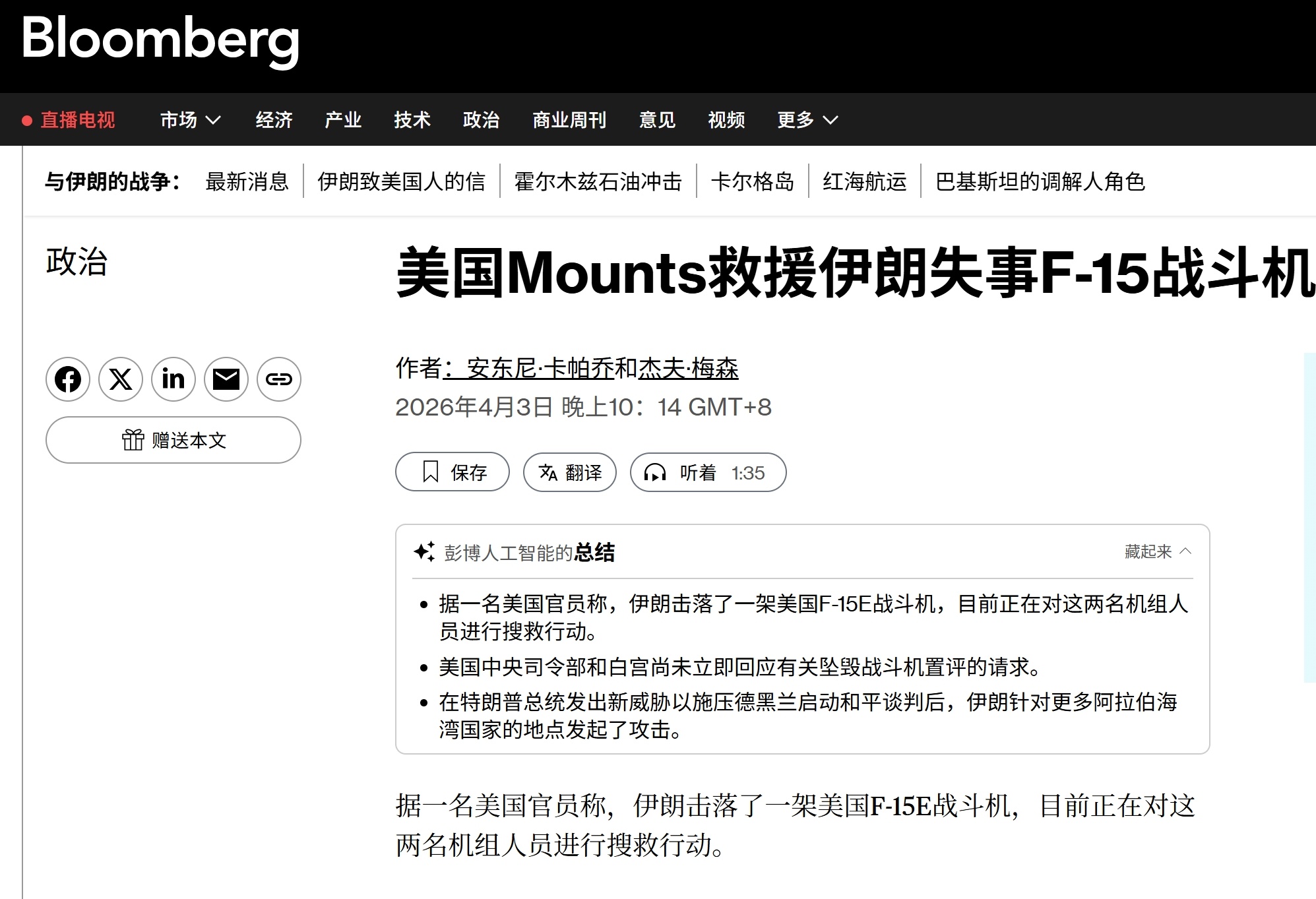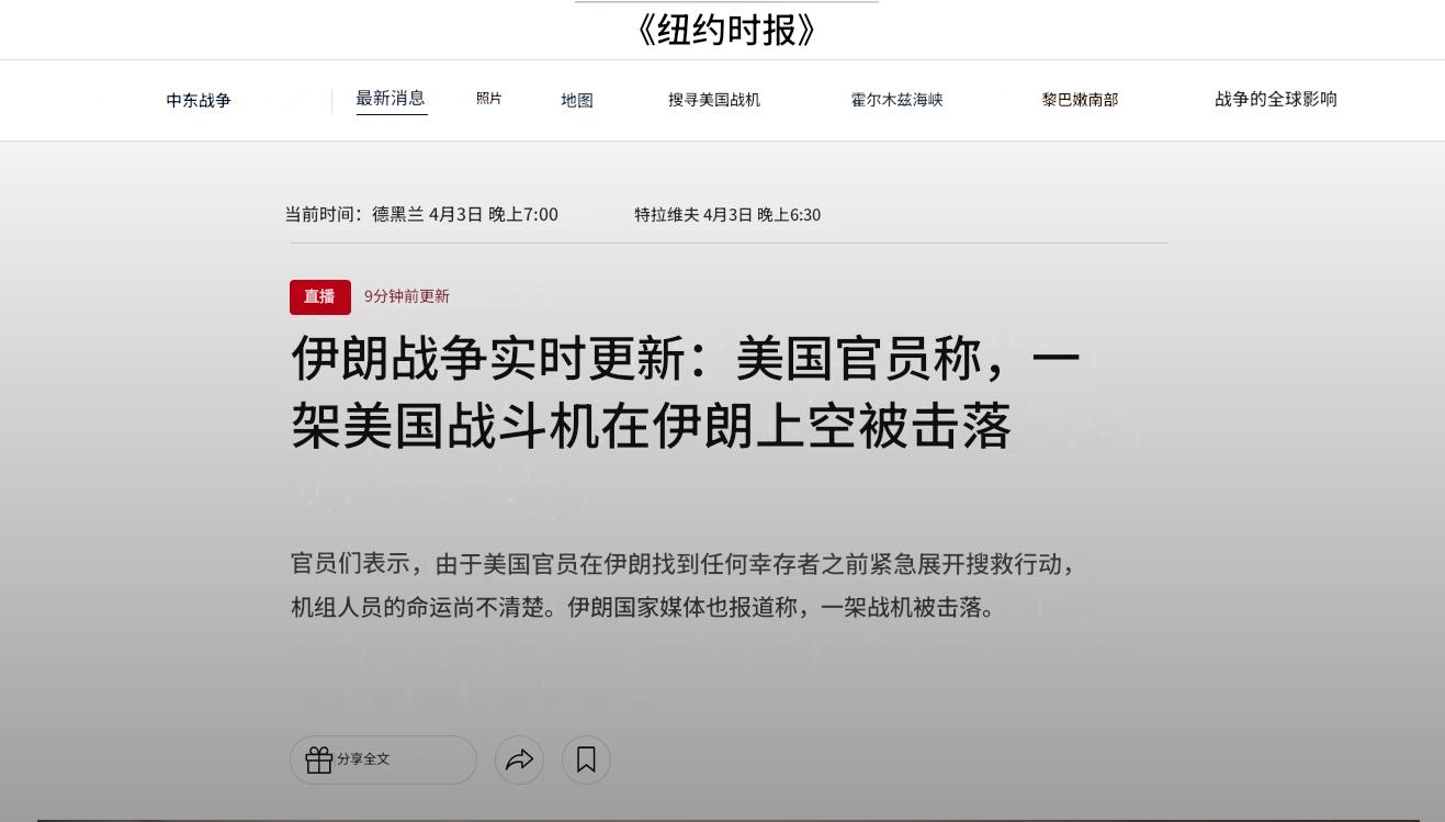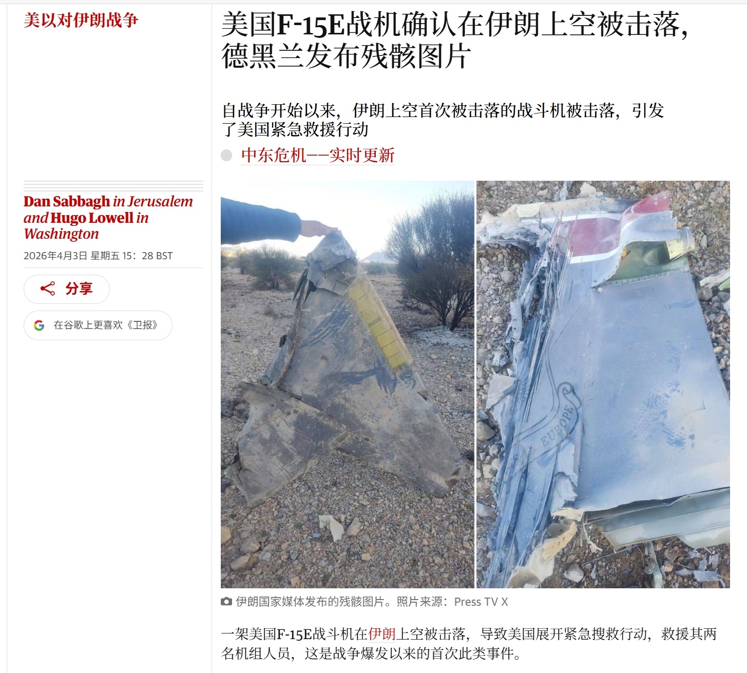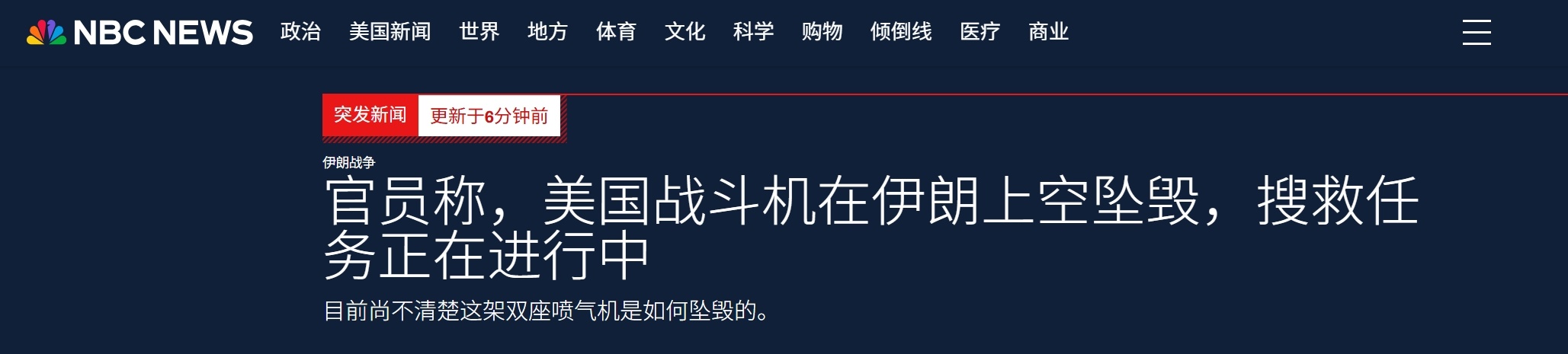 华盛顿邮报、Axios、卫报、纽约时报、NBC以及彭博社等西方媒体纷纷证实美军F-15E遭伊朗击落。美伊以冲突热点观点伊朗