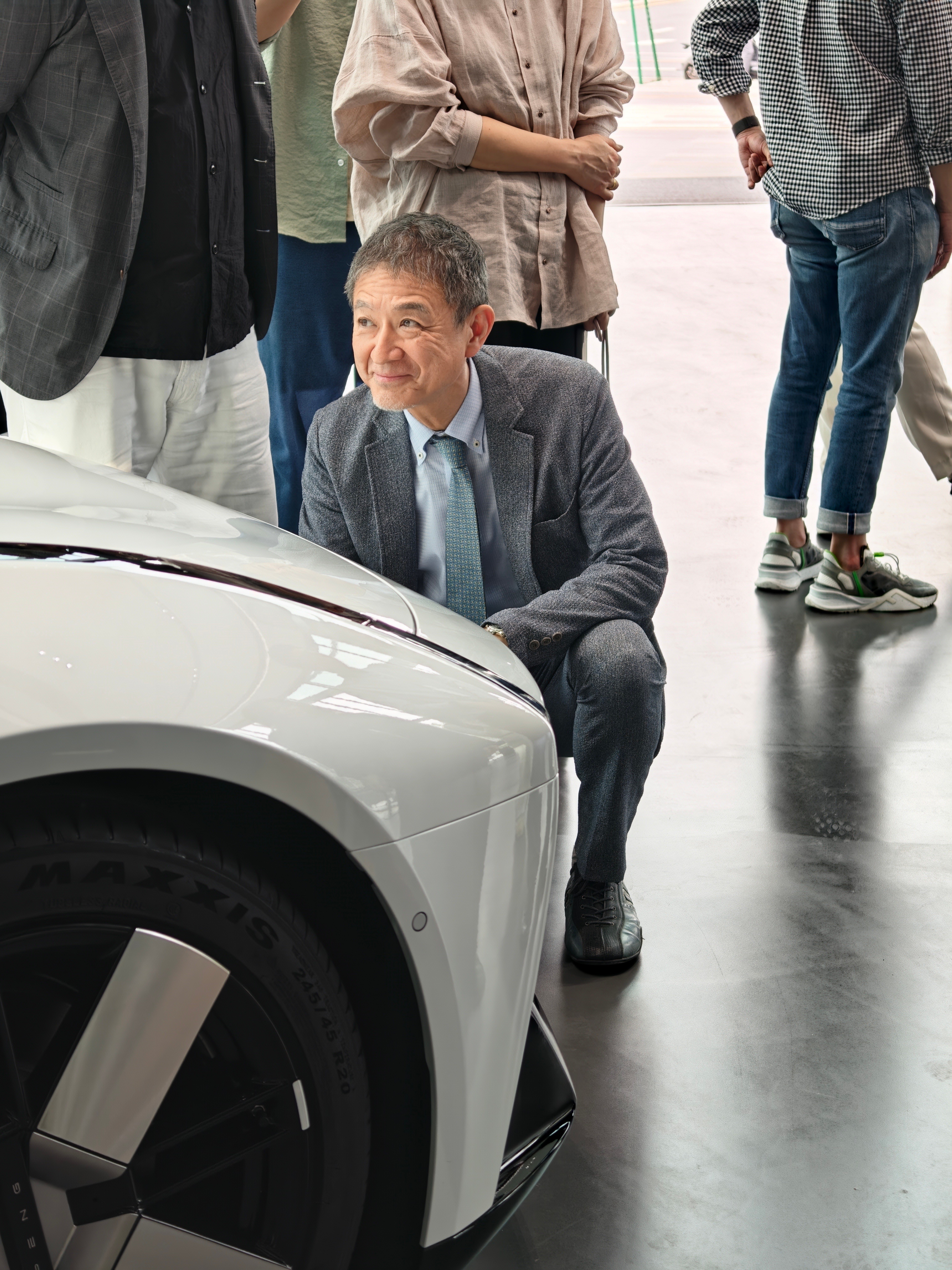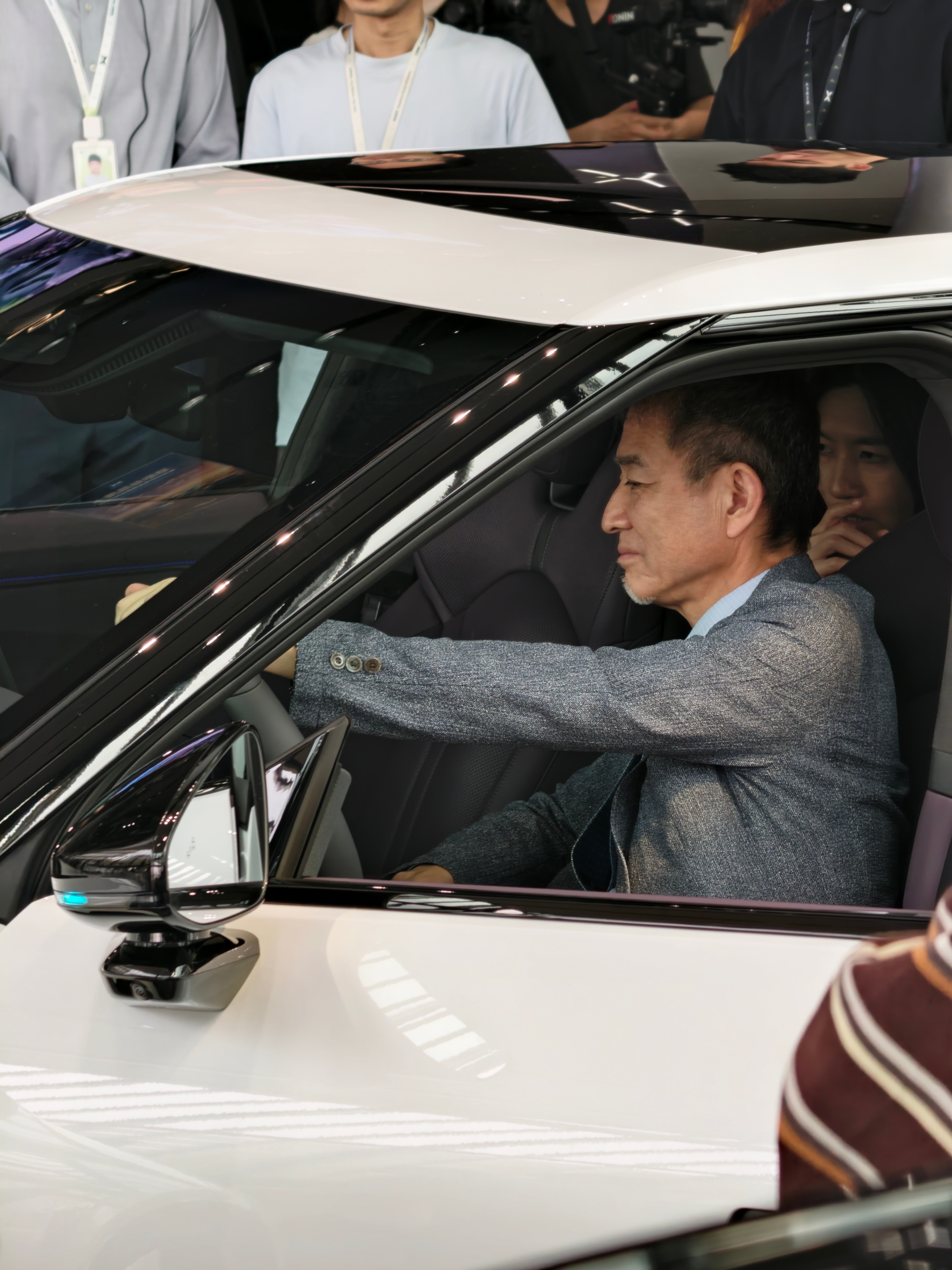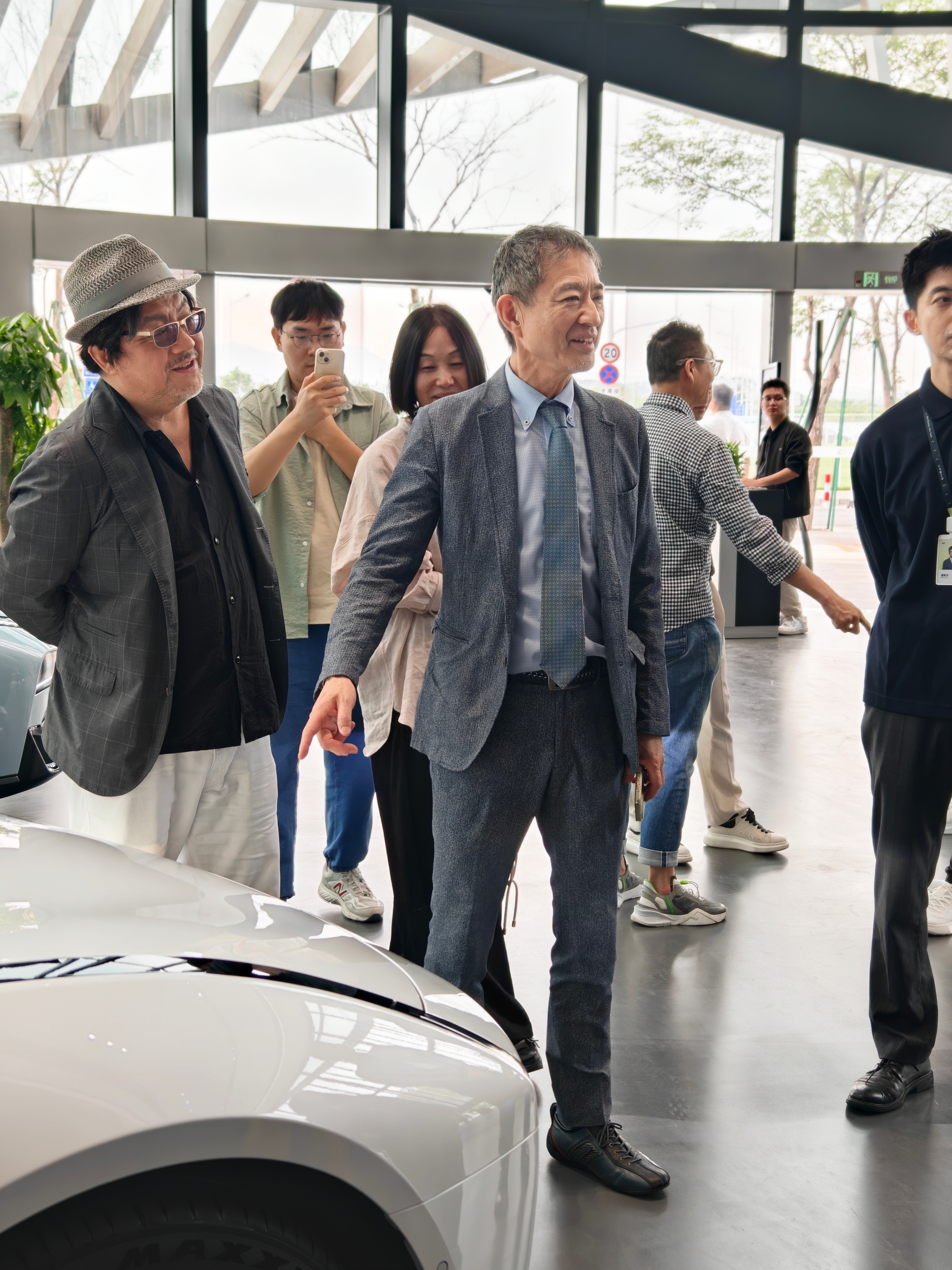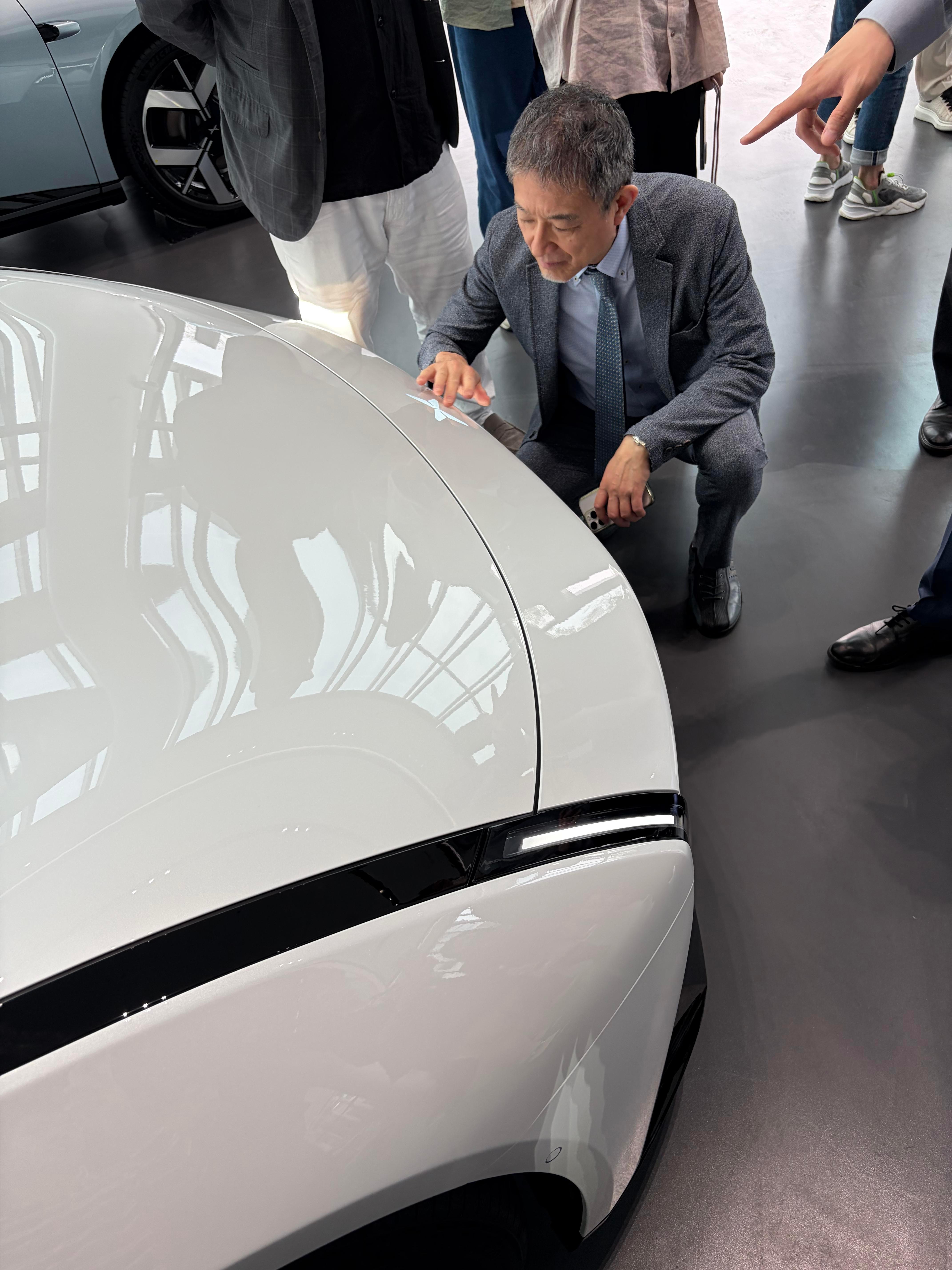 他俯身细察车身流体曲线,蹲下研究一体式纯平发光车标,对原创设计与工业美学进行 “像素级” 拆解。