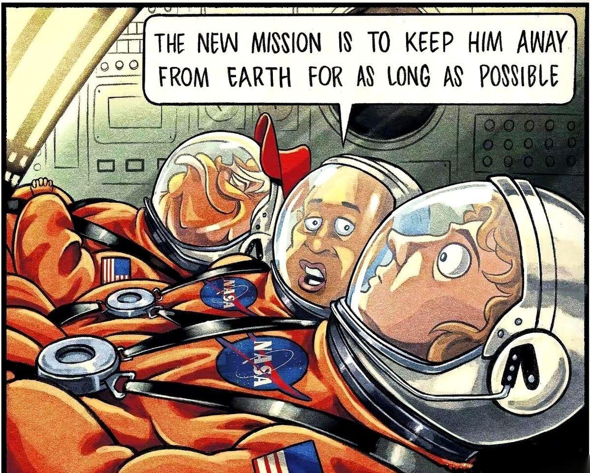 美国宇航局那个叫“阿尔忒弥斯2号”的载人绕月计划,最近动静不小。 但很多人盯着屏幕里那枚巨大的火箭,心里念叨的却不是宇航员,而是一个快七十岁的政客。 网上全是这种漫画:一个西装革履的人,被黄色胶带死死缠在火箭尖上,旁边一行小字写着:“越远越好。” 他们说,要把他绑上去,送走,送到38万公里外。 可另一边,真正坐在猎户座飞船里的宇航员,连在月球上踩一脚都不敢奢望。 为什么? 因为1969年那套能把人送上去的生产线,早就拆没了。重新再造一套,国会山的议员们捏着钱袋子,手抖。 所以只能绕一圈,就当是去打个卡。 这挺魔幻的。 一边是人类最顶尖的科技结晶,背负着几十年的技术断层和天文数字般的预算,小心翼翼地在冰冷的真空中划出一道弧线。 另一边,它在很多纳税人眼里,最大的价值,居然只是一个能把“讨厌鬼”扔得足够远的快递。