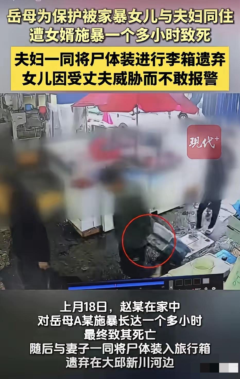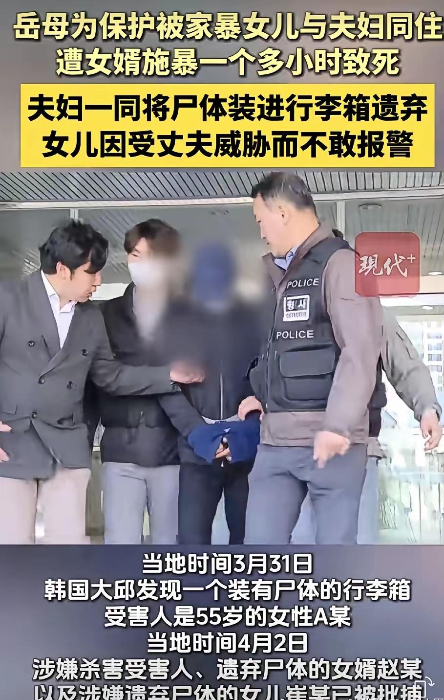 韩国一位母亲,发现自己的女儿经常被女婿家暴,为了保护女儿,她从去年9月份起,便搬到女儿家去住,从此岳母,女儿,女婿三人生活在一个屋檐下了! 按理说,母亲寸步不离守在女儿身边,这总该安全了吧?可现实远比想象中残酷得多。今年3月31日,韩国大邱新川河边,一个路人散步时发现溪里卡着个旅行箱,箱子缝里竟渗着血,打开后里面是55岁的母亲李某的尸体——她被女婿赵某活活打死后,装进箱子抛尸于此。你可能会问,女儿呢?她不但没报警,还帮丈夫一起把母亲的尸体拖去河边扔掉。 这一切是怎么一步步滑向深渊的?答案藏在那些被忽视的细节里。 女儿崔某和赵某去年9月结婚,婚后没几天拳头就落了下来。崔某瞒着母亲,可伤痕根本藏不住。母亲得知后当场就哭了,说什么也要搬进女儿婚房:“我得看着你,不能让他再欺负你”。谁也想不到,母亲的好意不仅没拦住拳头,反倒把她自己也推进了地狱。女婿赵某照打女儿不误,女儿心疼母亲受牵连,哭着求她走。母亲抱着女儿掉眼泪:“我走了,你一个人咋办?他会不会打得更狠?” 今年2月一家人搬去大邱中区一间单间公寓。搬家那天,岳母打包慢了,赵某上去就是一顿拳打脚踢。从那天起,岳母成了新的靶子,挨打成了家常便饭。3月18日,赵某回到家说岳母做饭噪音吵到邻居,上去就把她按在地上打。一个多小时的暴力持续到岳母没了呼吸。赵某慌了,把尸体塞进旅行箱,威胁女儿:“你敢说出去,我杀了你全家!”当晚,赵某逼着女儿一起去新川抛尸,没收了她的手机,寸步不离地盯着她。女儿后来对警方说,她怕丈夫报复才不敢报警。更让人细思极恐的是,警方调查后发现母女俩的手机早就被赵某没收,家里电话也拆了,她们根本没有向外求救的渠道。 这起惨案暴露出一个令人胆寒的现实:在极端封闭的家暴环境里,连报警的机会都被彻底切断。 放眼韩国家暴的整体状况,这张受害者的网远比我们想象的更大。根据政府调查,每三名韩国女性中就有一人至少经历过一次暴力,加害者多为前任或配偶。韩国女性热线数据显示,仅2024年就有至少181名女性被伴侣、前任或跟踪者杀害,几乎每两天就有一名女性丧命。然而遭受家暴后主动向警方求助的女性不到1%。无数人在黑暗中沉默忍耐,直到悲剧发生才被外界知晓。 回到这个案子。赵某目前被控杀害直系尊亲属罪和遗弃尸体罪,女儿崔某因协助抛尸也面临调查。但法律能彻底解决这个问题吗?受害者在极端控制中连拨通电话的机会都没有,再多法律条文在失灵的报警机制面前,都只是纸上谈兵。这位母亲拼了命去保护女儿,最后却死在了最想保护的人身边,而女儿连报警的勇气都被暴力碾碎了。 各位读者你们怎么看?欢迎在评论区讨论。