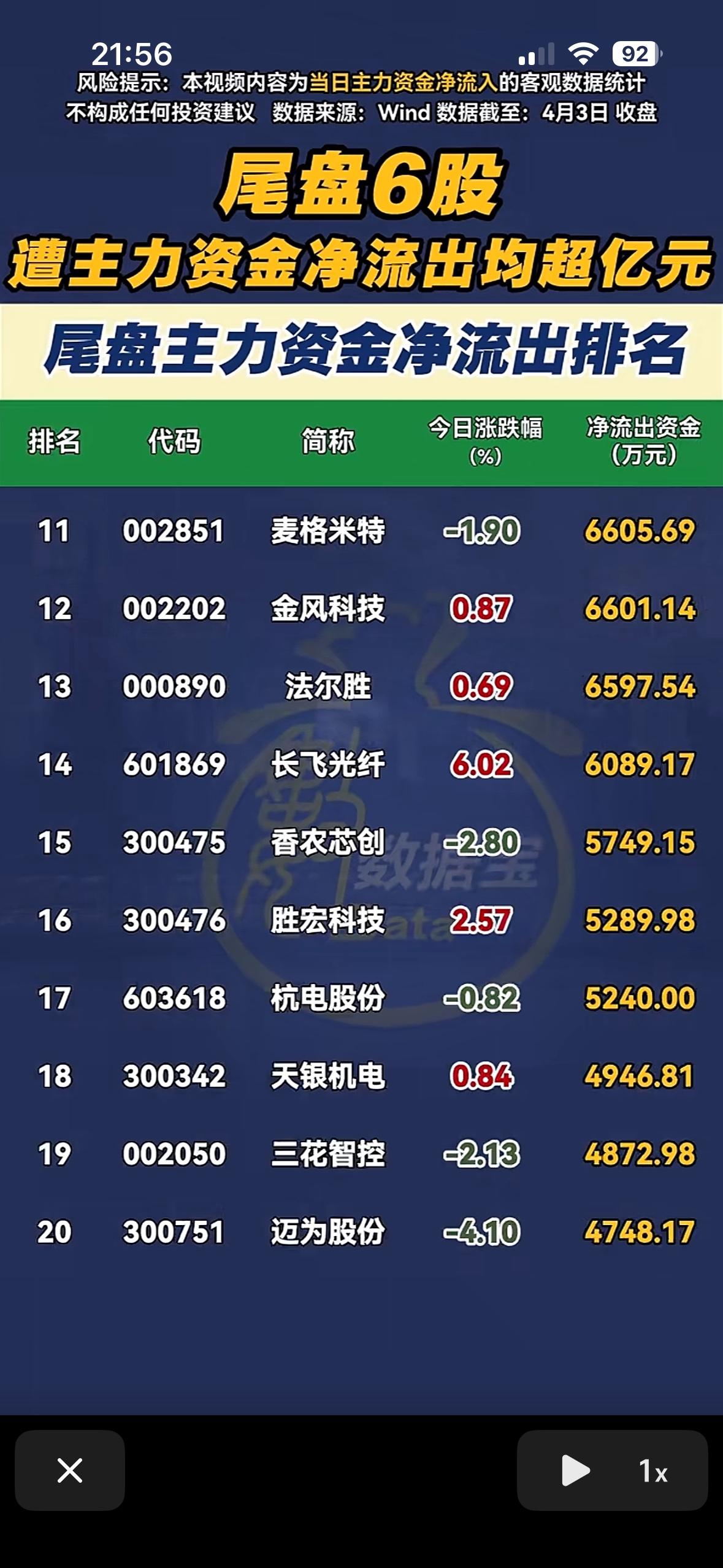 4月3日主力资金净流出排名前20的股票。核心结论非常清晰:市场正在进行剧烈的“高