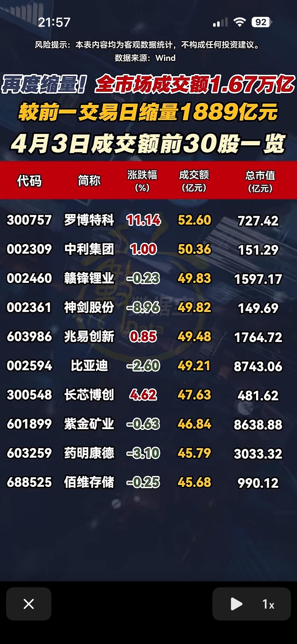 - 数据:全市场成交额1.67万亿,较前一日缩量1889亿。