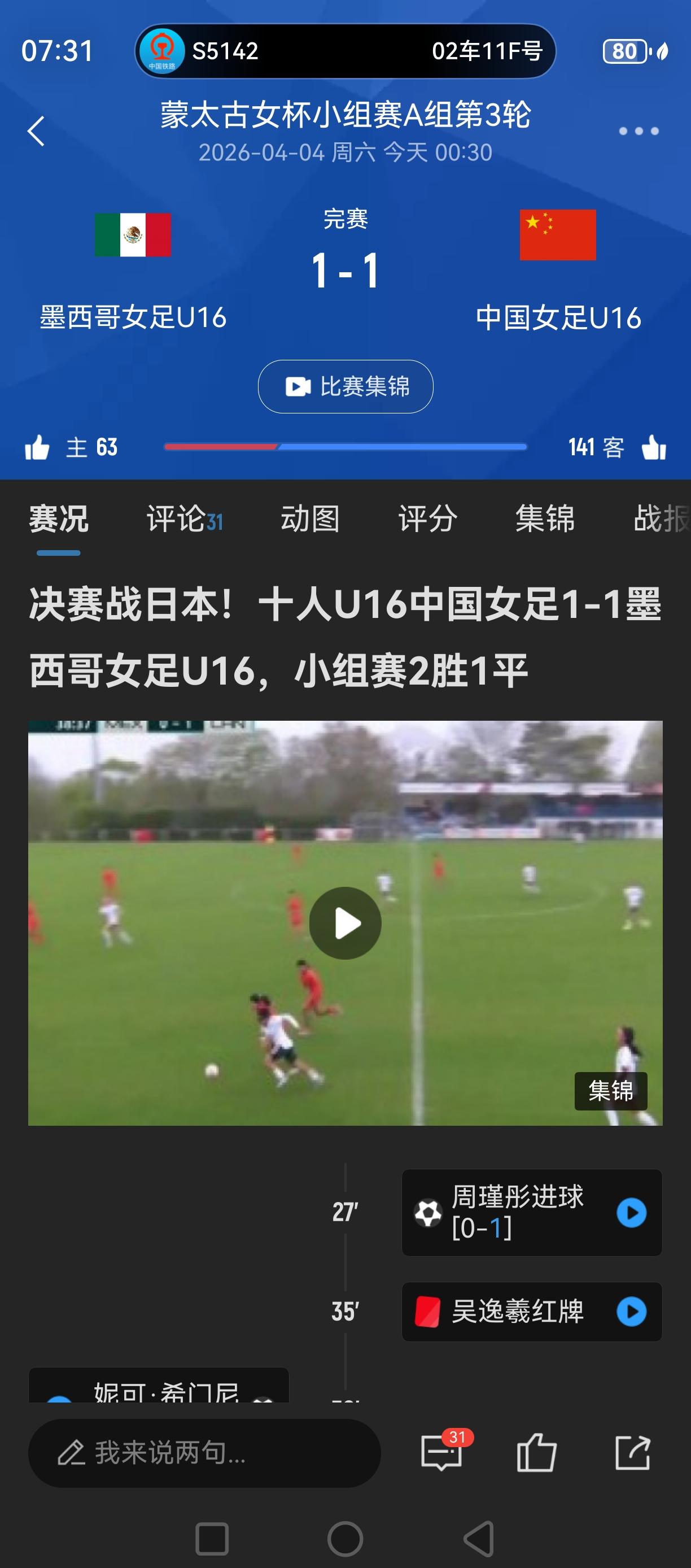 U16女足进决赛了!1:1,战平墨西哥! 先进球,后被罚下一人,10打11,逼平墨西哥! 这样,胜英法,平墨西哥! 进决赛了![赞][赞][赞] 将和日本女足争冠! 将蒙太古杯打成了亚洲杯![捂脸][捂脸][捂脸][赞][赞][赞][赞]