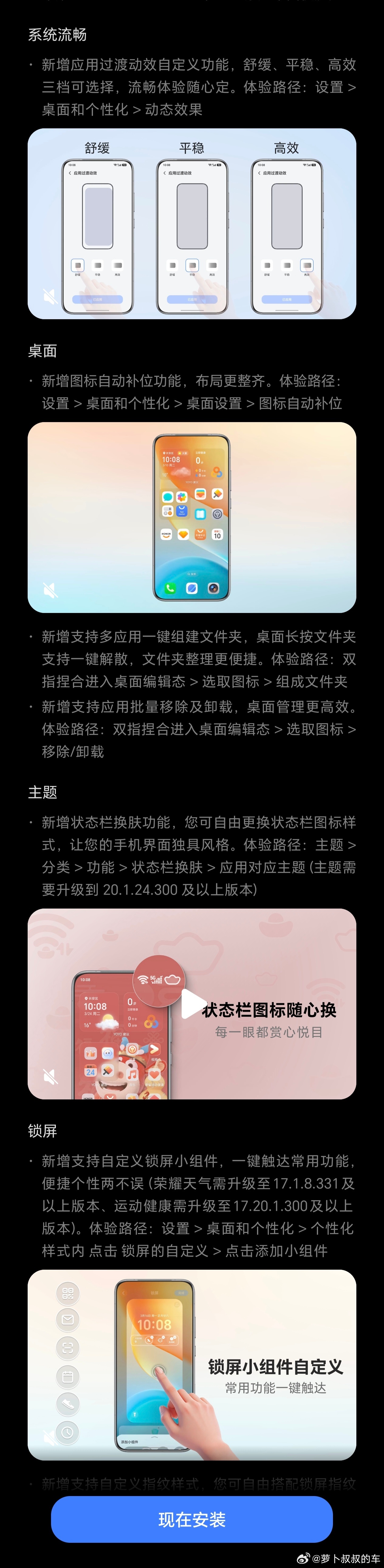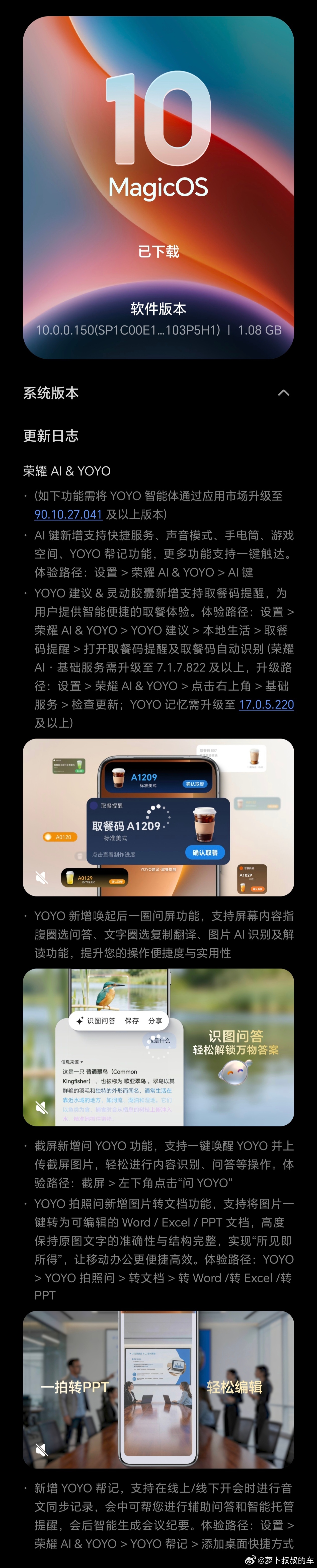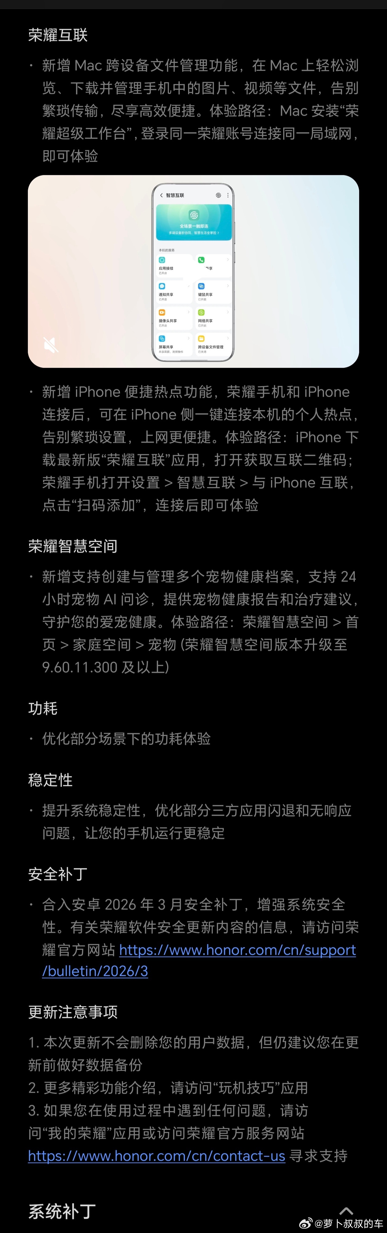 荣耀MagicOS迎来一次大升级,与苹果生态的互联互通以及系统个性化设置是两大升级亮点。其中,在苹果MacBook上可以直接管理荣耀手机的文件,iPhone可热点直连荣耀手机。另外,我发现荣耀的系统更新内容页面是图文并茂的详细,这似乎是业界的唯一。荣耀MagicOS