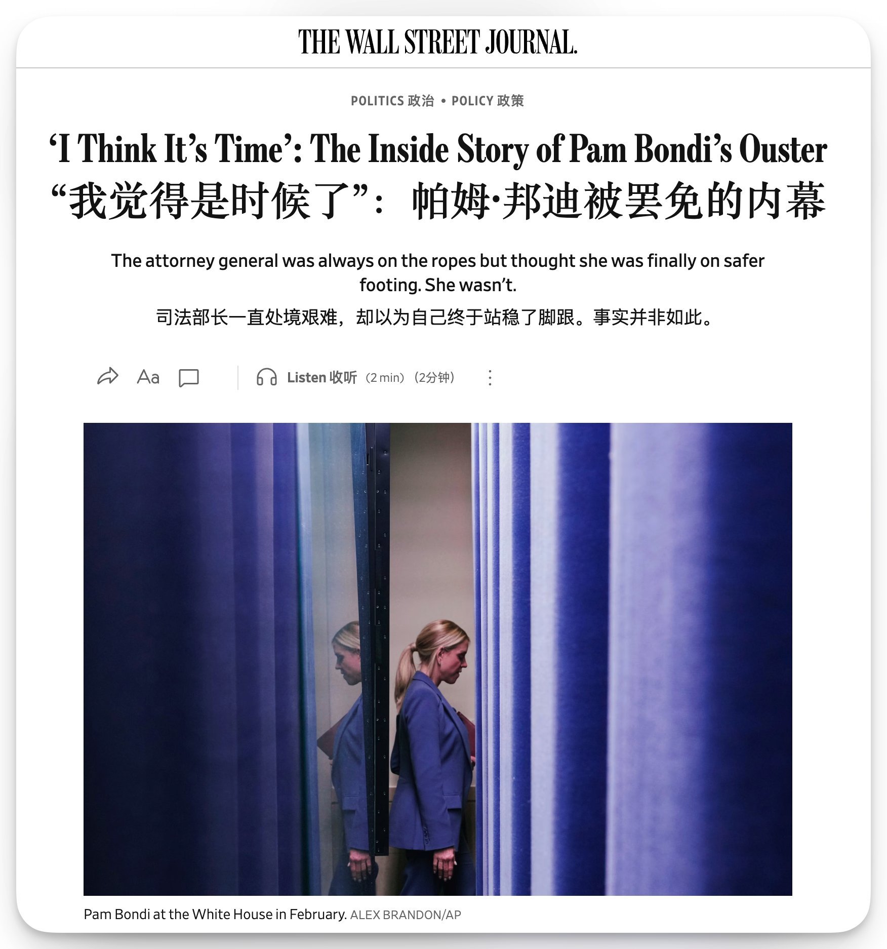¹ 特朗普认为她没能有效遏制爱泼斯坦文件的司法余波,认为她未能成功起诉他的政治对手。长期不难,今年初就敲打多次,终于炒鱿鱼。