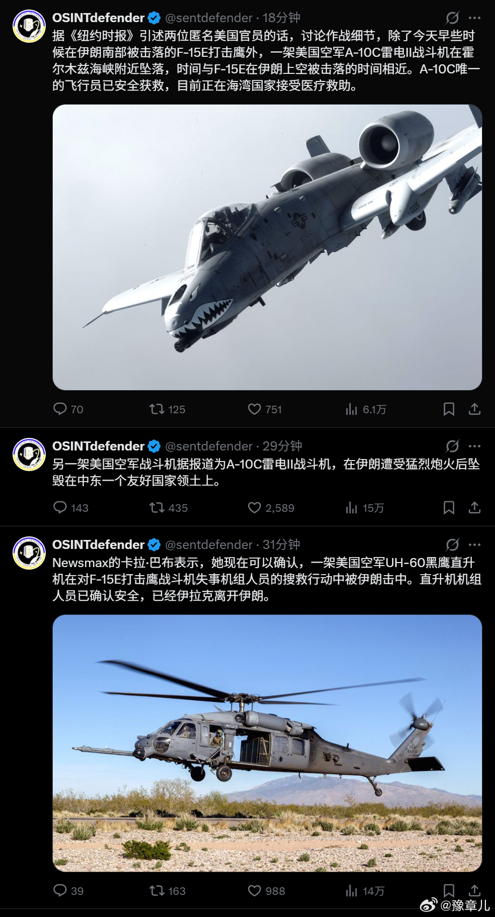 第二架被击落的F-15E坠毁后续未知,且确认深入伊朗搜寻第一架被击落的F-15E战机飞行员的HH-60G"铺路鹰"直升机遭伊朗袭击受损。