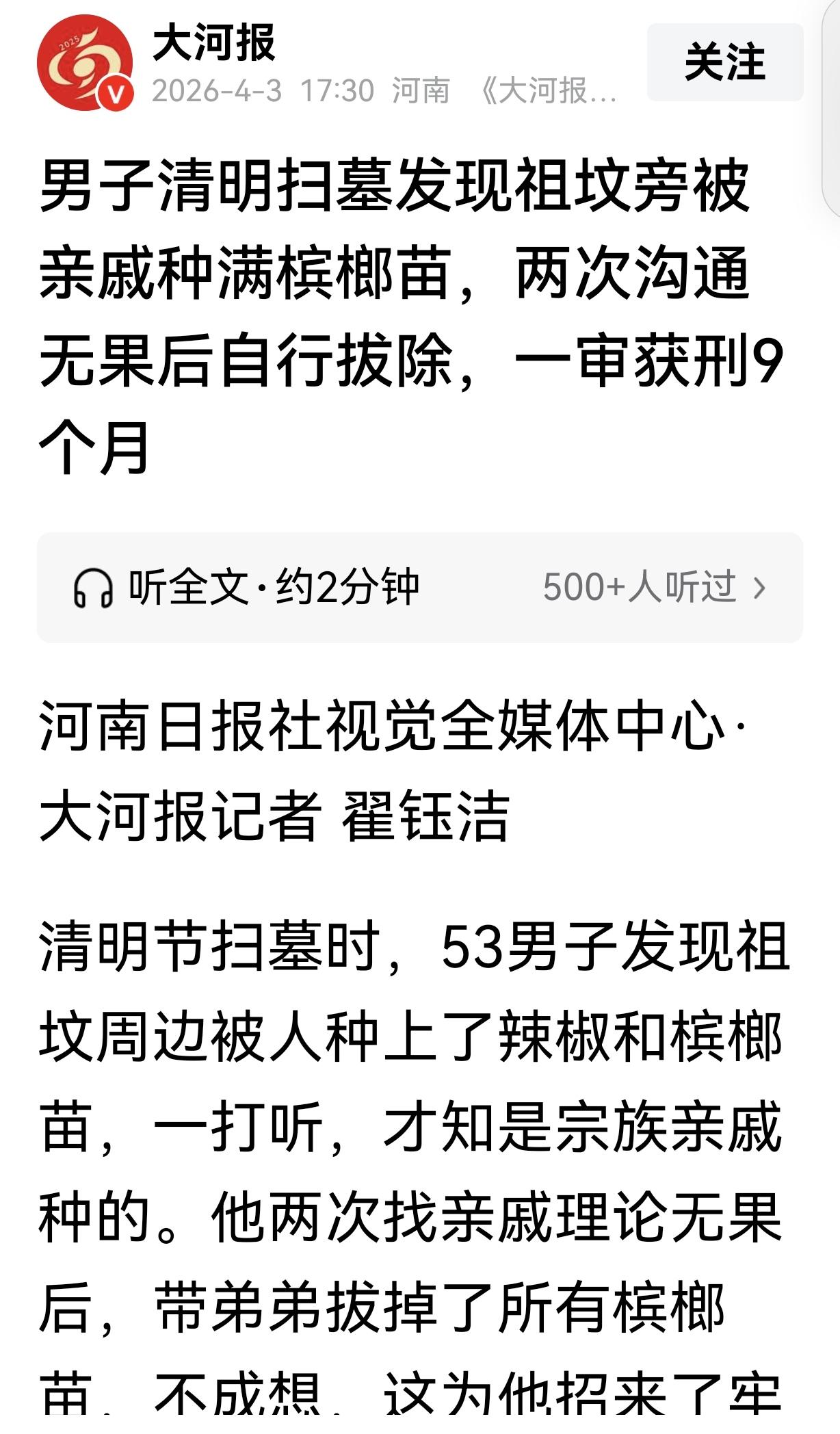 海南,一53岁男子清明扫墓祭祖,竟发现祖坟旁,被宗族亲戚种满槟榔苗和辣椒,可把男子气的不轻,亲戚没把自己放眼里,也是对祖宗的大不敬,他2次要求亲戚拔除,人家压根不搭理他,他一怒之下,拔除329株槟榔苗,让亲戚损失11186元,亲戚没事,他却被判刑9个月。男子彻底傻眼了。 2025年清明,陈某甲前一天准备好祭祖用的贡品,一大早带着家人去山上扫墓。 刚走到祖坟跟前,他就气得血压飙升。好好的祖坟周边空地,被人种满了槟榔苗和辣椒,绿油油的苗子挤得坟前连下脚的地方都快没了。 在他看来,这不仅是占了自家祖坟的地盘,更是对祖宗的大不敬,也没把他这个人放在眼里,否则谁会这么缺德,种地种到人家祖坟上来了? 他一打听才知道,这些苗子是宗族亲戚陈某乙种的。 在他看来,要是外人还有心可原,毕竟跟自己八竿子打不着。 可陈某乙跟他同宗同族,知道祖坟是他家的,还故意种槟榔苗,他这太不厚道了,是成心跟自己过不去。 陈某甲压着火气,2次找陈某乙理论,让他赶紧把苗子拔了,可对方根本不搭理他,一副“我种我的地,跟你没关系”的架势。 陈某甲气不过,4月10日上午自己跑到山上,拔掉了一部分槟榔苗,想着给陈某乙一个警告,如果再不拔除,对你不客气。 可等到下午,陈某甲再去看,剩下的苗子还好好长在那儿,陈某乙丝毫没有要清理的意思,这是在跟自己叫板吗? 这一下彻底把陈某甲惹毛了,当天晚上他喊上弟弟,两人一起把陈某乙种的槟榔苗全拔了个精光。 看着满地倒着的苗子,陈某甲觉得出了一口恶气,可他没想到,这事儿远远没结束。 没过多久,陈某甲就接到了法院的传票。陈某乙把他告了,说他故意毁坏财物,要求赔偿损失。 原来,那块地是村里的集体土地,陈某乙种槟榔苗也是经过允许的。 经清点,被拔掉的槟榔苗一共有329株,价格认定中心算下来,损失足足有11186块钱。 公诉机关指控陈某甲犯了故意毁坏财物罪,按照法律规定,他得负刑事责任。 陈某甲这才慌了,他以为是为祖坟出头,怎么就成犯罪了? 好在他后来主动投案,还如实交代了自己的行为,又把赔偿的11186块钱提存到了法院,算是有了悔罪表现。 法院审理后,考虑到这事儿是因为土地纠纷引起的,陈某甲又是自首,还愿意赔偿,最后判了他有期徒刑九个月,缓刑一年。 也就是说,只要在缓刑期间不犯错,他就不用真的去坐牢。 拿到判决书的陈某甲彻底傻眼了,他怎么也想不到,就因为拔了几百株槟榔苗,差点蹲大牢。 这事儿在当地传开后,不少人都议论纷纷,有人说陈某乙不该在祖坟旁边种东西,也有人说陈某甲太冲动,不该用违法的方式解决问题。 这事儿也给大家提了个醒,遇到纠纷哪怕再有理,也得通过合法途径解决,一时冲动动手,最后吃亏的还是自己。 好好的清明扫墓,最后闹成这样,实在得不偿失。 《刑法》第275条规定,故意毁坏公私财物,数额较大或者有其他严重情节的,处三年以下有期徒刑、拘役或者罚金;数额巨大或者有其他特别严重情节的,处三年以上七年以下有期徒刑。 陈某甲虽因祖坟被占心生不满,但2次协商无果后,没通过村委调解、法院起诉等合法途径解决,而是故意拔除陈某乙的329株槟榔苗,造成11186元的财产损失,已达到“数额较大”的标准,符合故意毁坏财物罪的构成要件。 不过法院考虑到案件因民间纠纷引发、陈某甲有自首及悔罪表现,最终判处缓刑,判决合理。 对此,你怎么看?