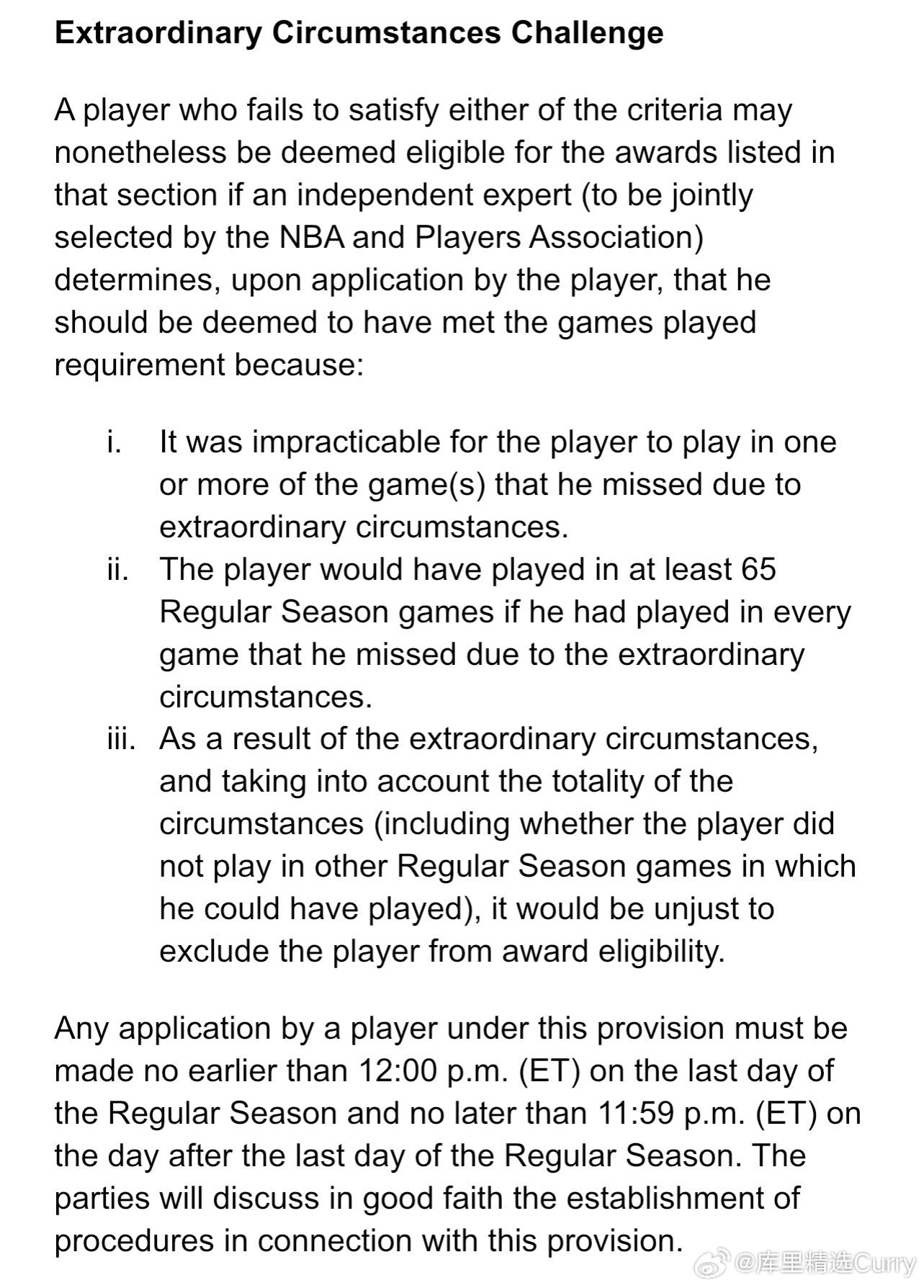 如果一名球员未能满足相关标准中的任意一项,在球员提出申请后,只要由一名独立专家(由NBA与NBPA共同选定)认定其应被视为满足出场比赛要求,那么该球员仍可被视为有资格参与该部分列出的奖项评选,理由如下: