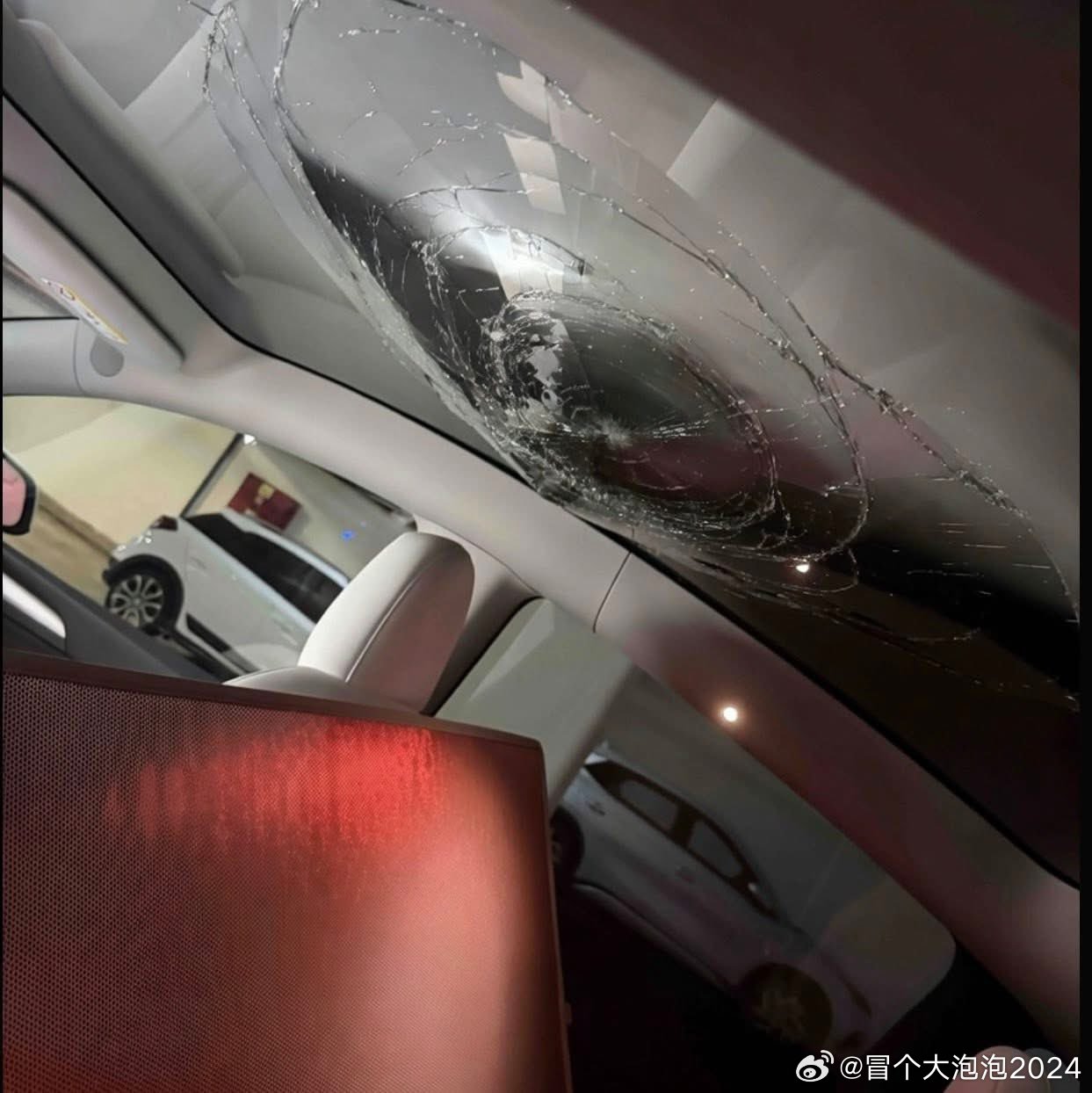 照片显示,一辆停在以色列停车场的特斯拉Model Y被火箭弹/导弹碎片击中——车窗玻璃破碎,车内无人受伤。
