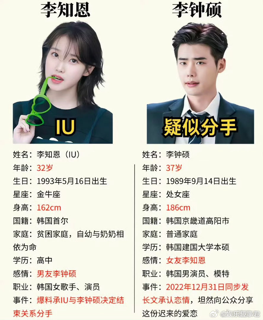 曝IU李钟硕分手网传IU与李钟硕已和平分手,2022年底官宣的顶流恋情疑似终结。