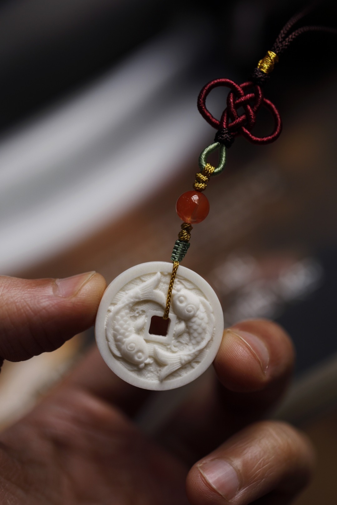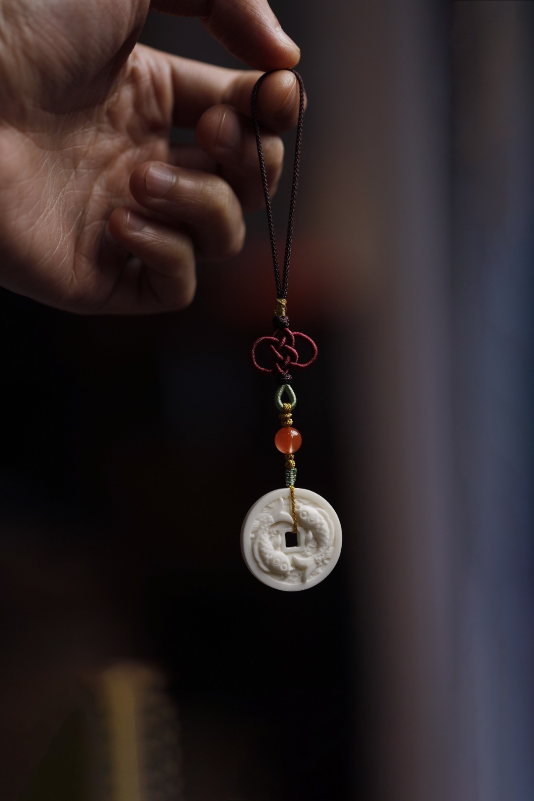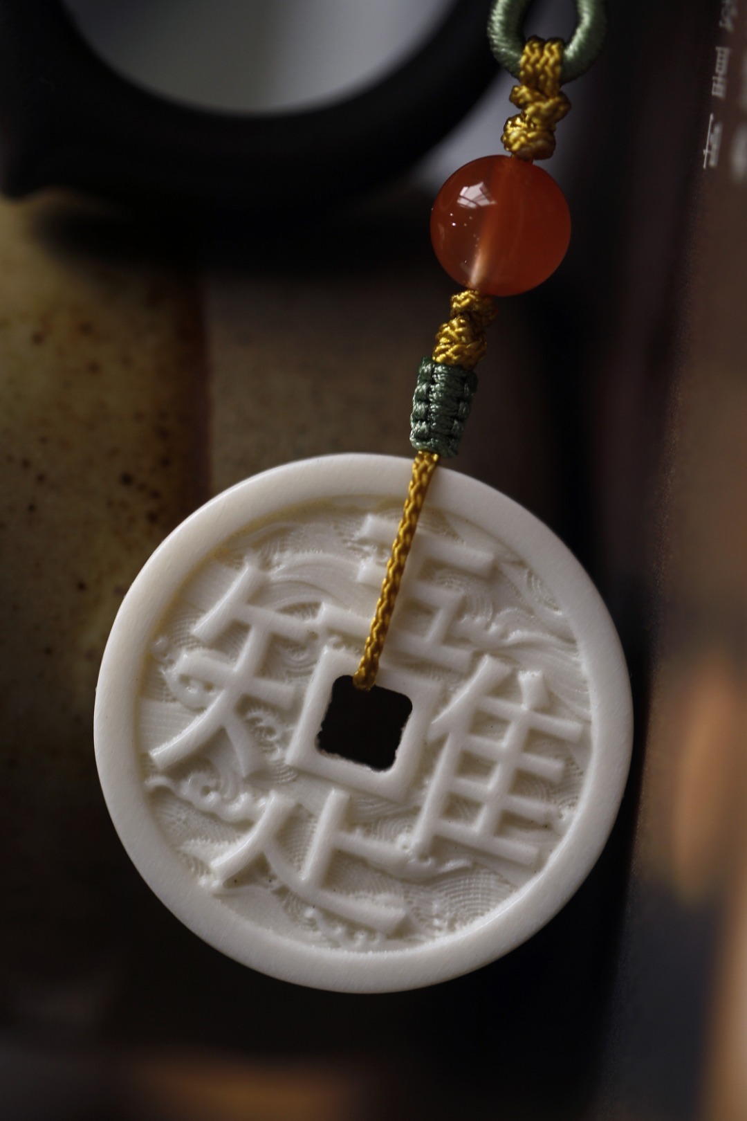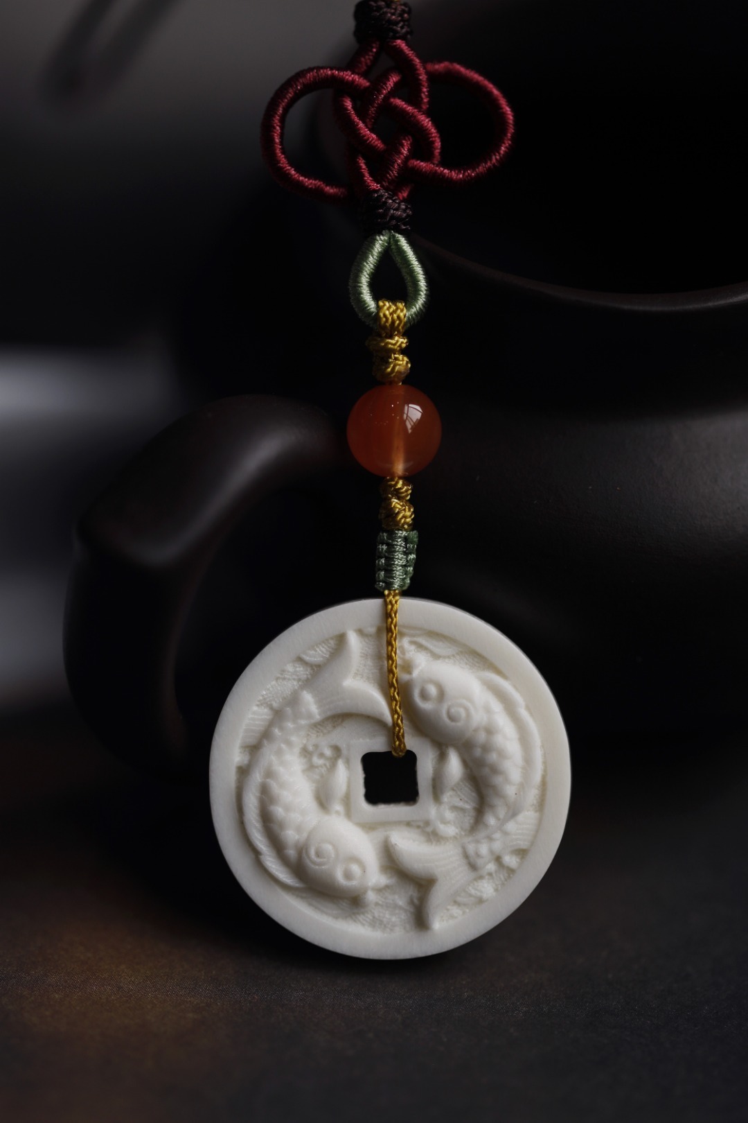 鹿角双面雕刻,形制古钱币,浮雕“唯吾知足”,安于所得、珍惜当下,背面双鲤鱼,寓意内心平和,年年有余。