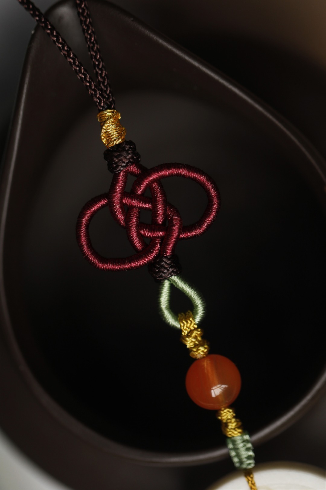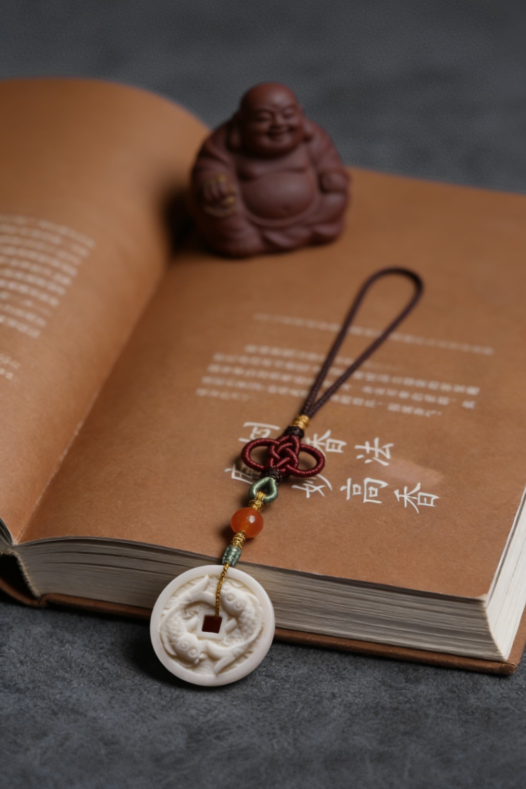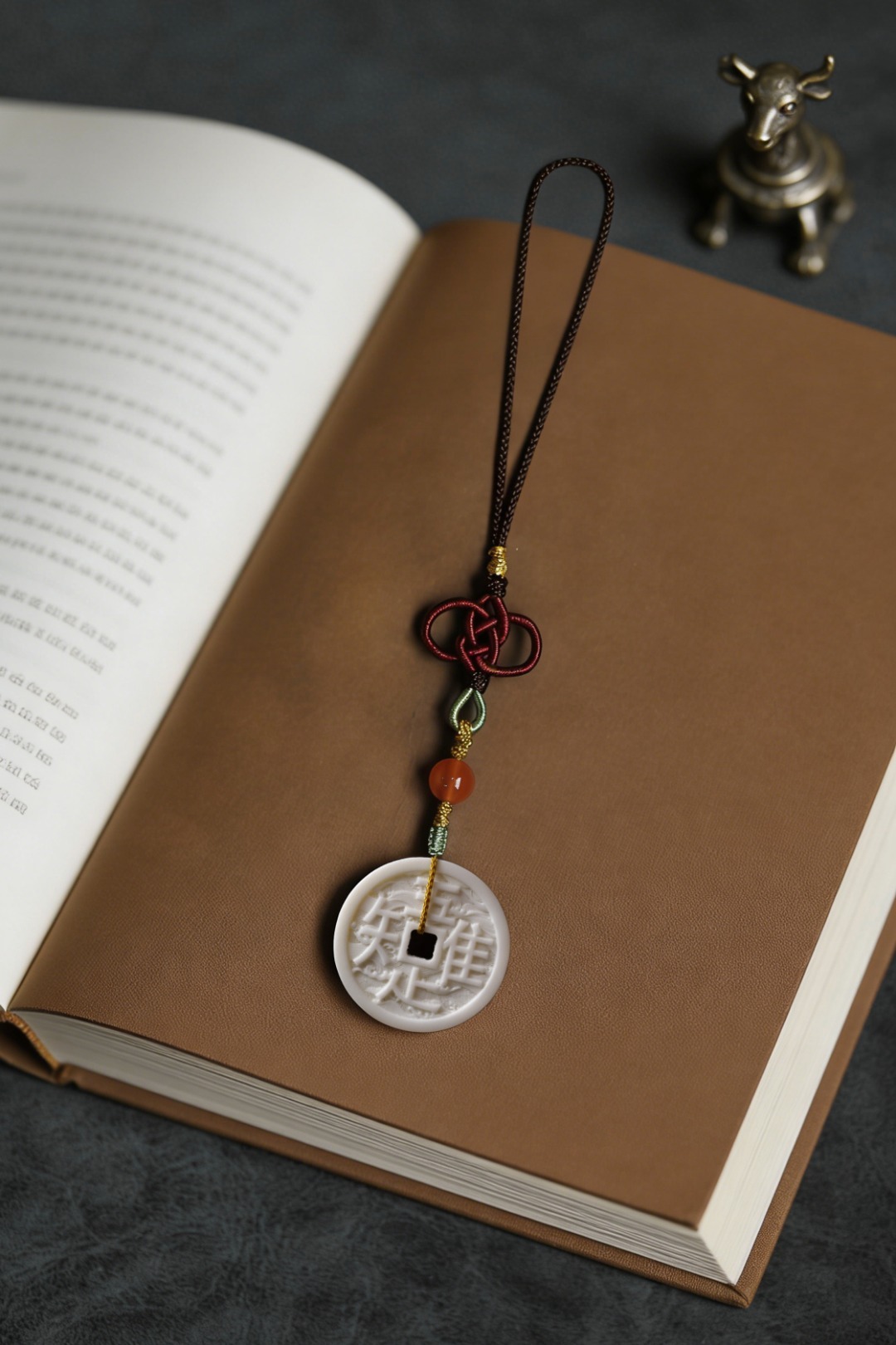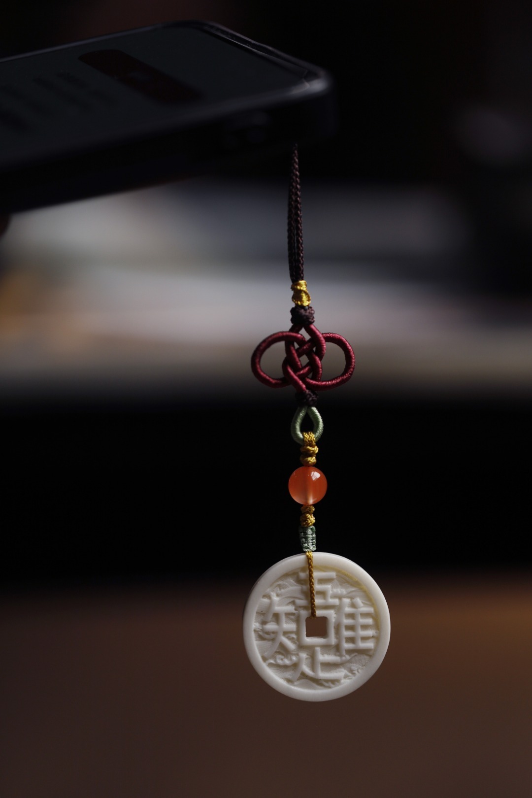 鹿角双面雕刻,形制古钱币,浮雕“唯吾知足”,安于所得、珍惜当下,背面双鲤鱼,寓意内心平和,年年有余。