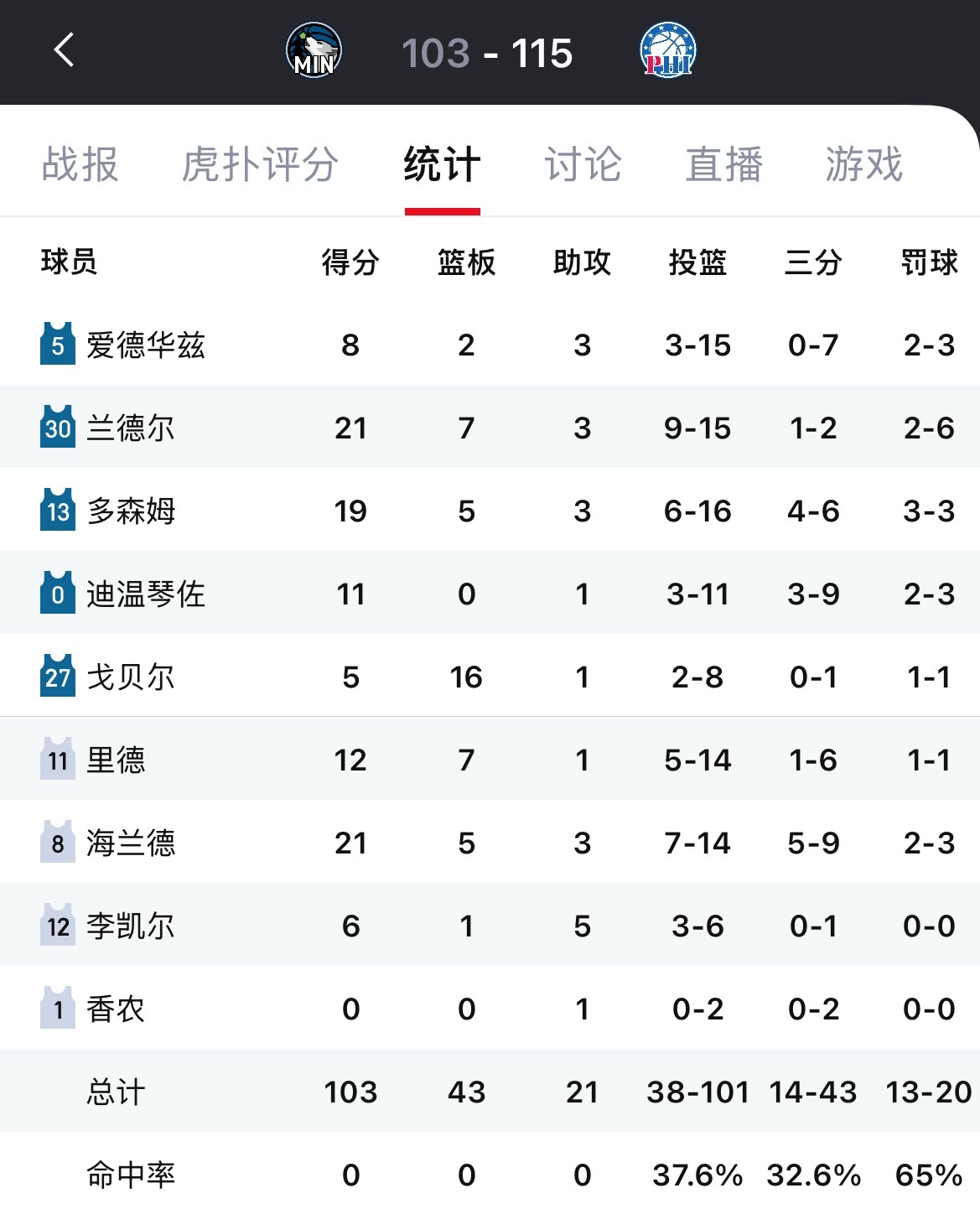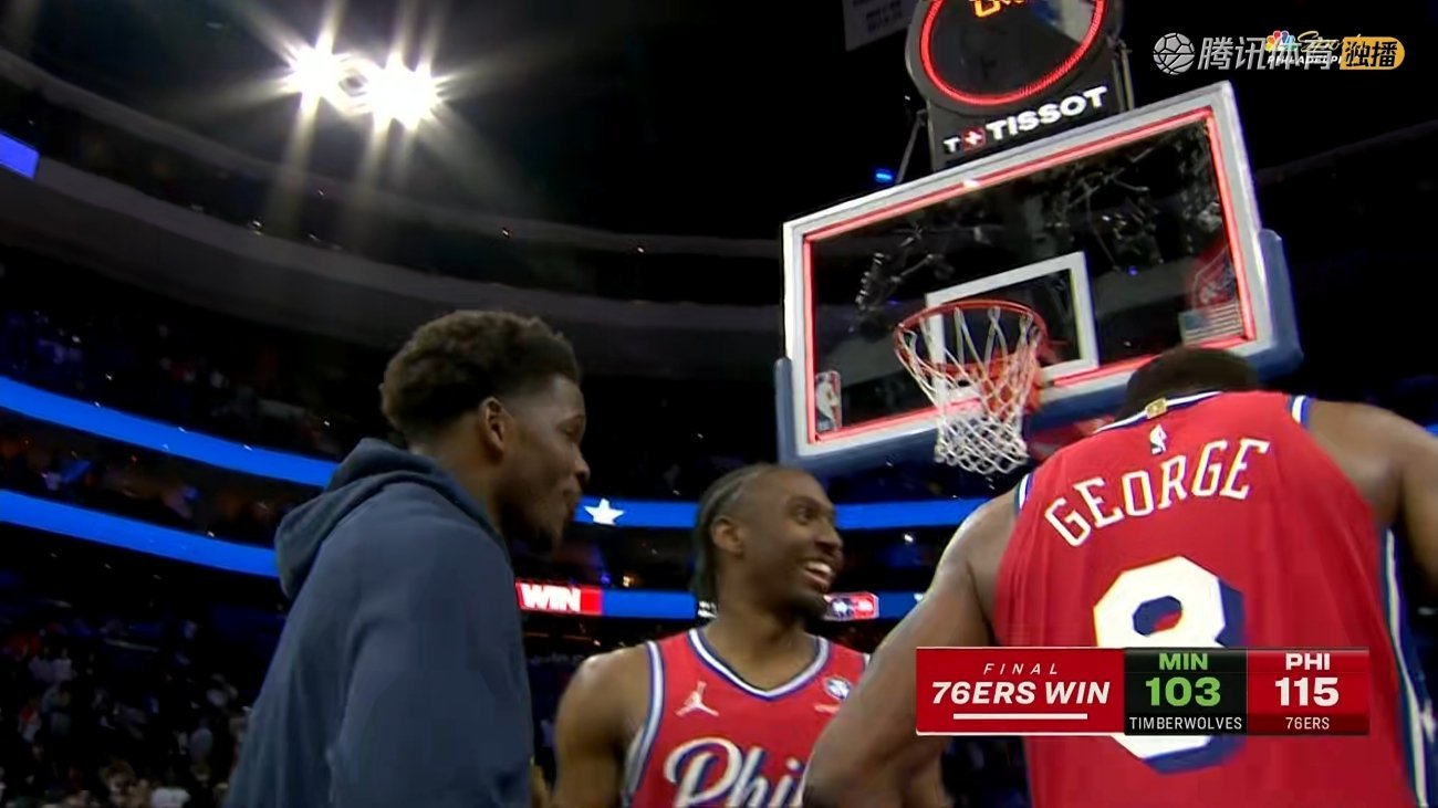 森林狼客场103-115不敌76人,已落后火箭1.5胜场!爱德华兹复出仅得8分,