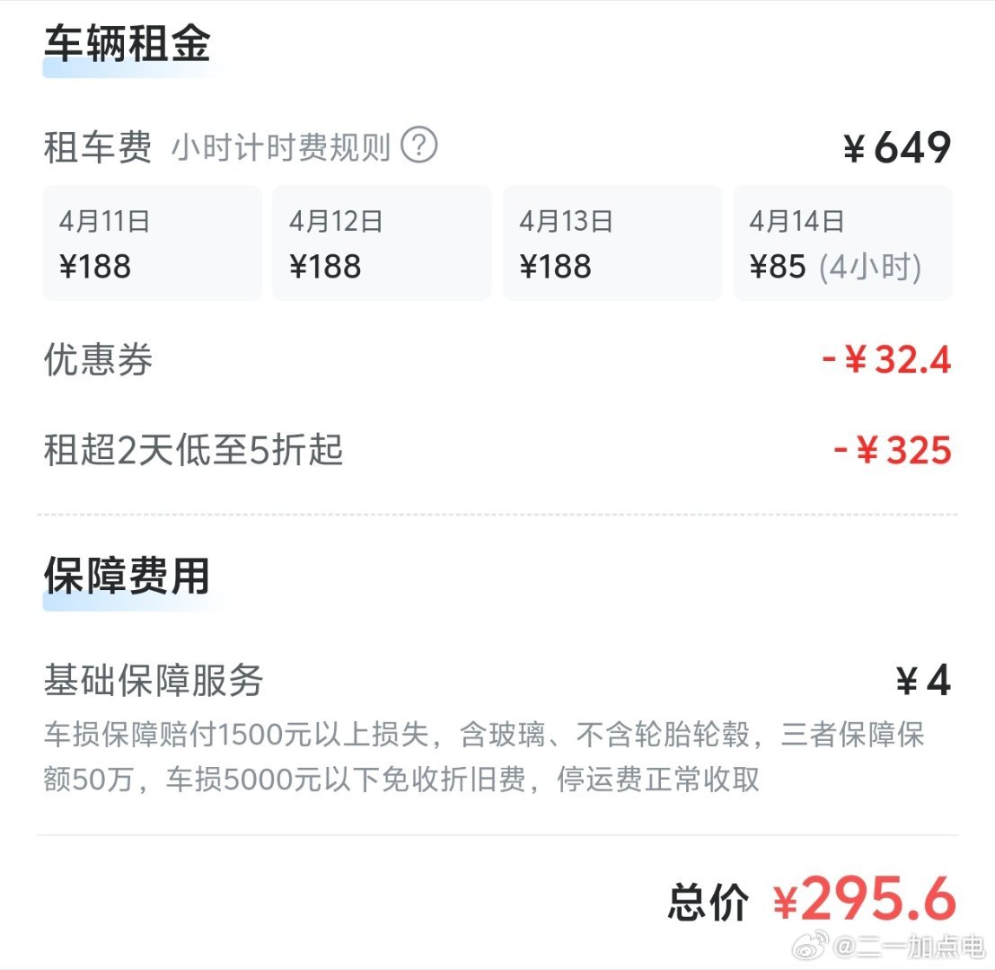 最后考虑到家庭出游需求,还是租了台理想L7,最终价格4天不到300块钱,对比了一下哈啰最便宜。因为很贴心的最后一天只算4个小时的价格,不像有些平台你多1个小时都算你4天整的