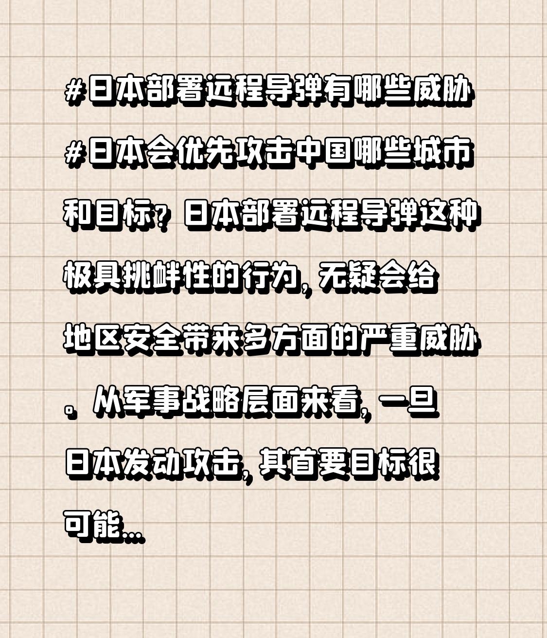 从军事战略层面来看,一旦日本发动攻击,其首要目标很可能是我国东部沿海的重要军事基地。像浙江、福建等地的军事设施,这些地方是我国海防的前沿阵地,拥有众多先进的战机、舰艇等装备。日本若攻击此处,旨在削弱我国的军事防御和反击能力,试图在战争初期取得一定的优势。 经济目标也会是他们的重点考量。上海作为我国的经济中心,金融、贸易、航运等领域高度发达。一旦这里遭受攻击,将会对我国的经济体系造成巨大冲击,打乱经济发展的节奏。此外,广东的深圳、广州等城市,是我国重要的制造业和科技创新基地,攻击这些地区会严重影响我国的产业布局和经济稳定。 交通枢纽同样是潜在的攻击目标。例如,北京作为我国的交通核心,机场、铁路枢纽等基础设施一旦受损,不仅会影响人员和物资的流通,还会干扰国家的应急指挥和调度。 然而,日本必须清楚地认识到,中国拥有强大的国防力量和完善的防御体系。我国的导弹防御系统能够对来袭的导弹进行有效拦截,同时我国的战略威慑力量也足以让任何胆敢进犯的势力付出沉重代价。日本若真的采取冒险行动,必将自食恶果,引发的后果将是其无法承受的。这种危险的举动不仅会破坏地区的和平与稳定,也会将日本自身推向万劫不复的深渊。我们必须保持高度警惕,做好应对各种风险的准备,坚定捍卫国家的主权和安全。