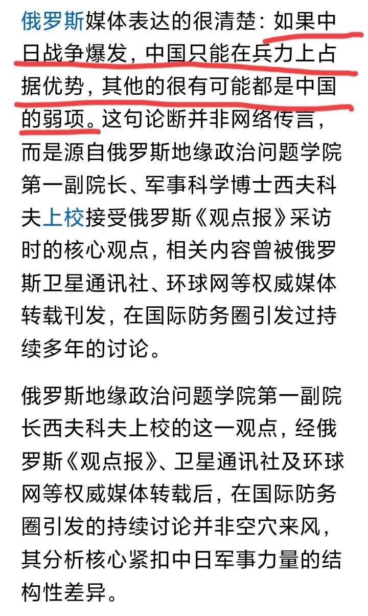 图一说,俄罗斯媒体分析,如果中美开战,中国除了人多,在各个环节,几乎都处于劣势, 图二说,俄罗斯博士分析,如果中日开战,中国除了人多,在各个方面,几乎都处于劣势, 大家说,这两篇小文章,像不像复制批发的? 假如不制止这种胡说八道,不久后就会看到: 俄罗斯媒体分析,如果中菲(菲律宾)开战,中国除了人多,其他都是劣势, 俄罗斯媒体分析,如果海峡两岸爆发统一之战,大陆除了人多,其他都是劣势…… 这样的小文章,可信吗? 这些小编的背后,有什么势力支持他们?