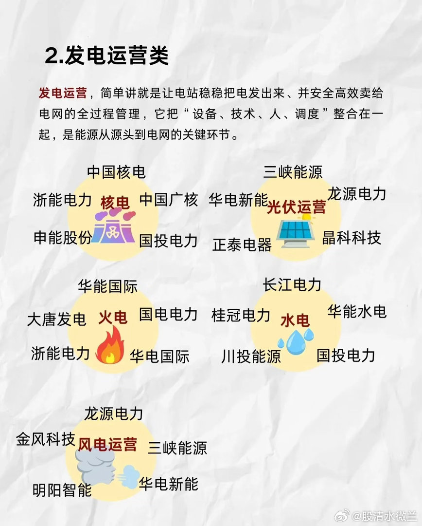 - 核电:中国核电、浙能电力、中国广核、申能股份、国投电力- 光伏运营:三峡能源、华电新能、龙源电力、正泰电器、晶科科技- 火电:华能国际、大唐发电、国电电力、浙能电力、华电国际- 水电:长江电力、桂冠电力、川投能源、华能水电、国投电力- 风电运营:龙源电力、金风科技、三峡能源、明阳智能、华电新能