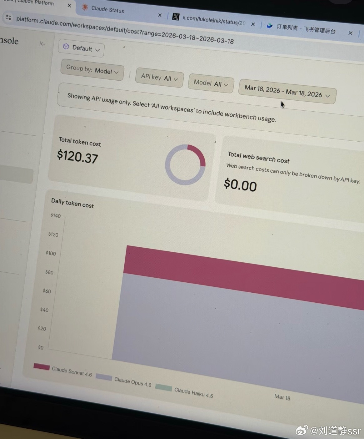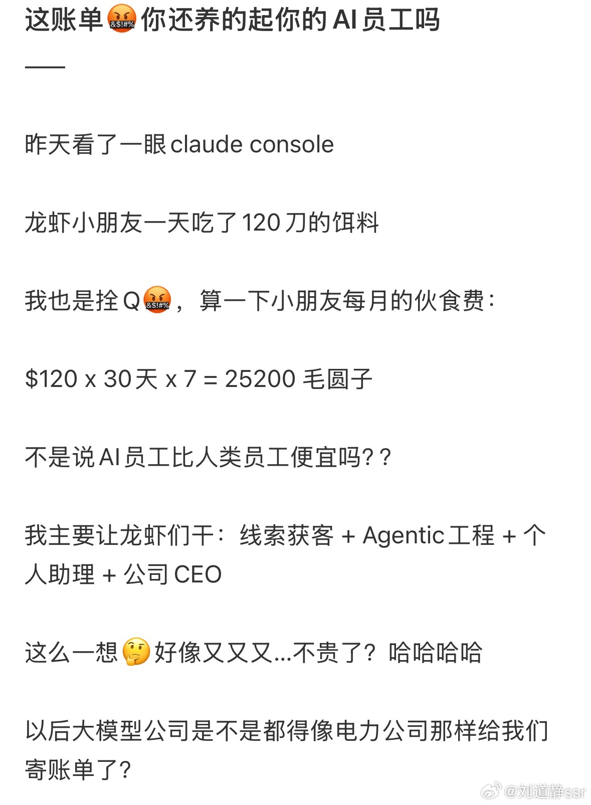网友分享养龙虾一天用掉120美金这个时代能用上无限token是不是约等于财富自由