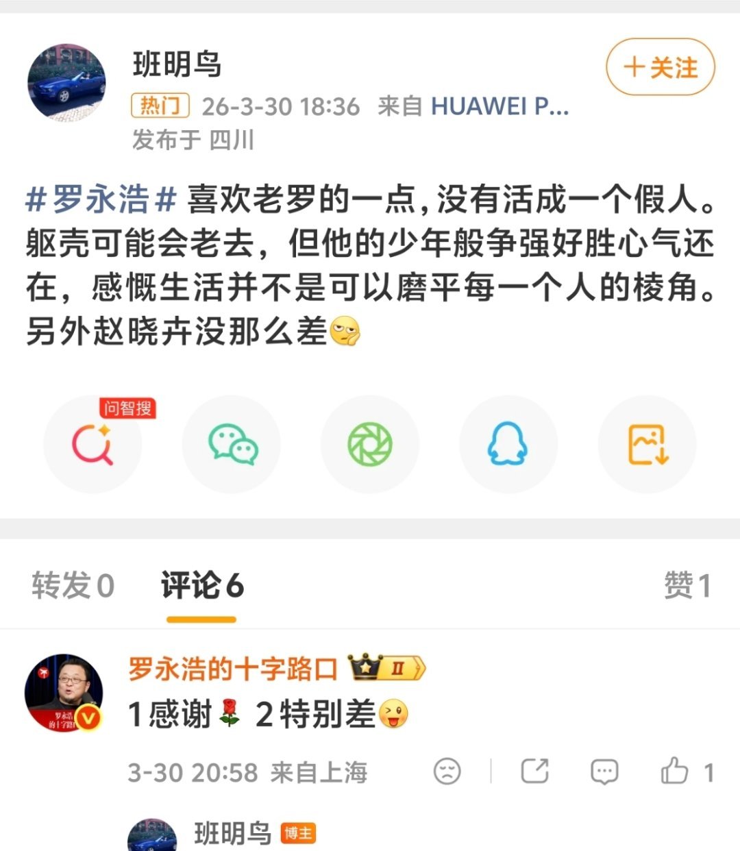 罗永浩和赵晓卉什么仇什么怨啊?罗永浩在回应网友互动时,对赵晓卉开炮了——“(赵晓卉)脱口秀水平是完全不入流的,只是观众缘好一些。“我也谈不上多讨厌,但她就是作品烂,这么多年一个不烂的作品都没有,只有一次告别演讲还凑合。”罗永浩还评价赵晓卉:特别差。#罗永浩##赵晓卉#