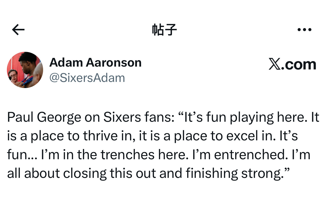 谈及在76人球迷面前打球——“在这里打球很开心。这是一个能让你茁壮成长、崭露锋芒的地方。这种感觉很棒…我已经完全融入这里,扎根于此。我现在一心只想好好收尾,强势结束这个赛季。”