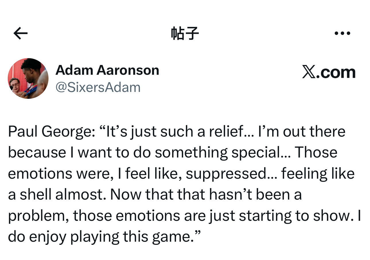 保罗·乔治赛后采访时,谈及自己近期的表现——“真的是如释重负…我站在场上,就是想要打出一些特别的表现…那些情绪,我感觉一直都被压抑着…(此前)感觉自己几乎就像个空壳。现在问题已经不复存在,那些情绪才开始真正流露出来。我现在真的在享受打比赛。”
