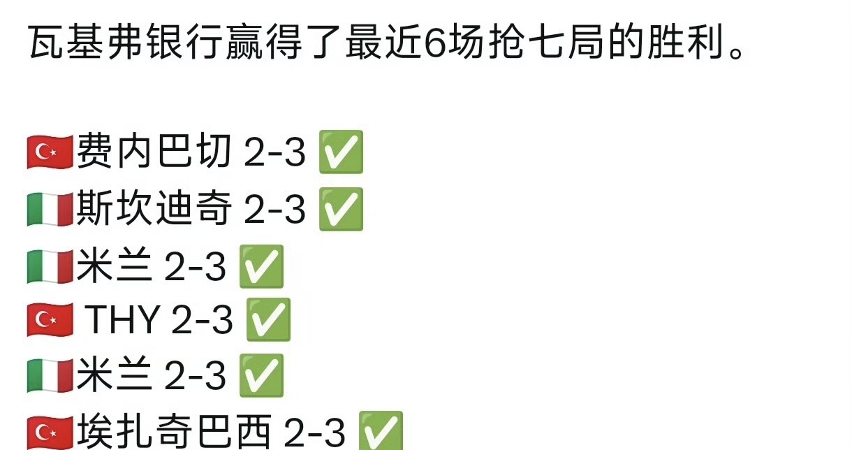 瓦基弗银行女排进欧冠决赛? 在最近的几场关键比赛中,土耳其瓦基弗银行已经赢了6场五局大战,特别是上一场的土超半决赛第二回合对阵实力强大且发挥出色的伊萨奇巴希,有着“小朱婷”之称的马尔科娃更是打出46扣25中2被拦、50%之高的进攻效率,可见,瓦基弗银行多次经历了艰苦的场面,马尔科娃、博斯科维奇等球员表现也更加有韧性,照这趋势下去估计进接下来的欧冠决赛应该不会是问题!