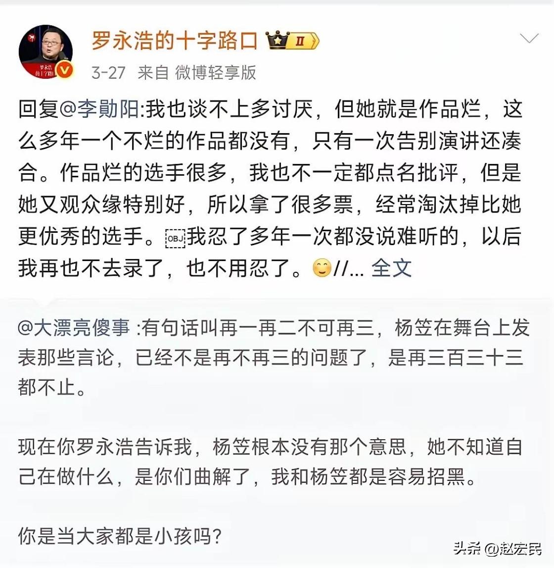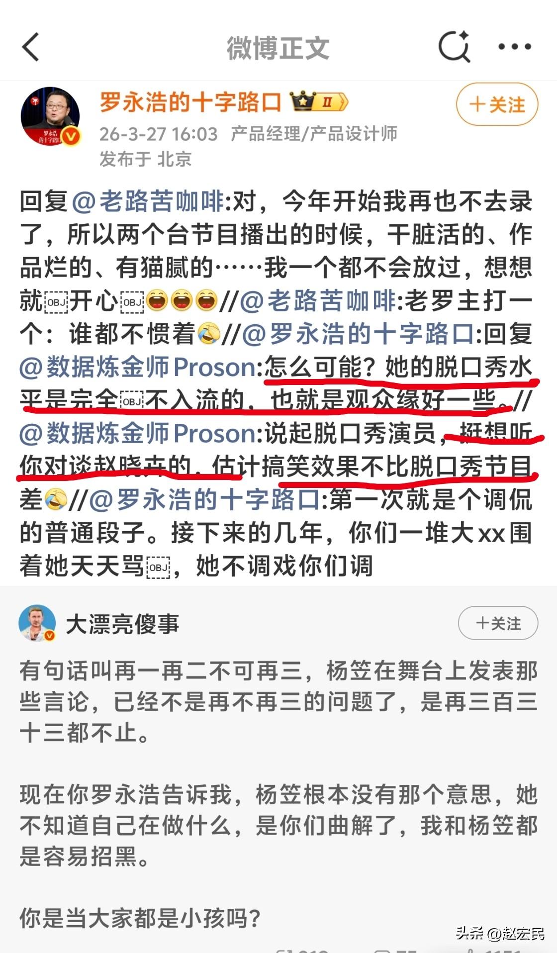罗永浩和赵晓卉什么仇什么怨啊? 罗永浩在回应网友互动时,对赵晓卉开炮了—— “(赵晓卉)脱口秀水平是完全不入流的,只是观众缘好一些。 “我也谈不上多讨厌,但她就是作品烂,这么多年一个不烂的作品都没有,只有一次告别演讲还凑合。” 罗永浩还评价赵晓卉:特别差。#罗永浩##赵晓卉#
