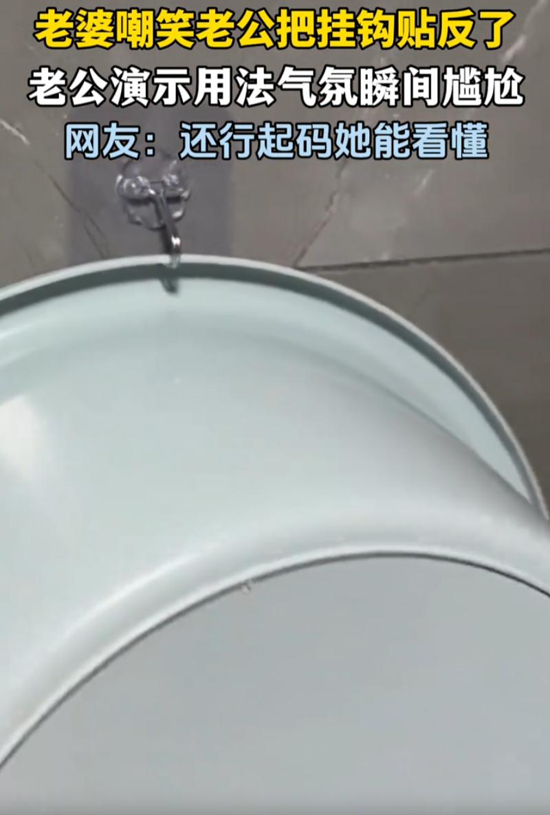 笑不活了!山西,女子发现老公在卫生间的挂钩挂反了,对着他各种嘲笑,没成想,老公当着他的面展示了挂钩的功能,事实证明挂钩并没有挂反,反倒把老婆知识面给探出来了,网友:她老公,听我一句劝,先别要孩子! 当天,女子去卫生间,看到墙上的挂钩是倒过来的,就开始嘲笑老公,平时老公总是说她笨,这次终于让她逮到机会了 老公一句话都没有回,他拿起一个洗脸盆,往墙上一靠,盆稳稳当当地挂在了那个倒过来的挂钩上 屋里瞬间安静了 女子这才反应过来,原来这种挂钩设计成倒着贴,不是为了挂毛巾衣服,而是专门用来挂盆的。盆的边缘刚好能卡进倒钩里,贴墙一放,不占地方,还滴水到地上 女子不服气,自己拿了一个同样的挂钩,翻来覆去研究了好一阵,愣是没搞明白怎么挂上去。老公接过去,手一抬,啪一下,完事 这下她彻底绷不住了。虽然老公还是没说话,但她已经开始撒娇式反击:你说话声音小一点! 问题是,人家压根没说话啊 网友看热闹不嫌事大:不是我挑事,你老公沉默的声音太大了,明显不服你 笑归笑,这个事也是挺有趣的,两个人过日子,一个发现不对就急着下结论,另一个遇事不慌不忙,先把事实摆出来。这种性格反差,磨合好了是互补,磨合不好就是天天掐架 这女子最后撒娇那一下,其实挺聪明的。知道自己理亏了,硬撑着没用,干脆用软的方式收场。两口子过日子,不就是你笑我我笑你,谁也别太当真 不过话说回来,那个挂钩的设计确实有点反直觉。大多数人看到钩子,第一反应就是朝上挂东西。谁会想到倒过来是为了挂盆?这不能全怪她,只能说生活里的巧思有时候就是反着来的