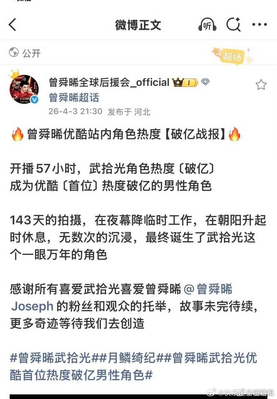 曾舜晞武拾光优酷站内角色热度破1亿曾舜晞双平台破万男主 从9700万盯着屏幕一直刷新到破亿的那一刻,眼泪真的憋不住了。曾舜晞做到了,武拾光做到了,优酷首个破亿男角色,我们一起创造了历史。