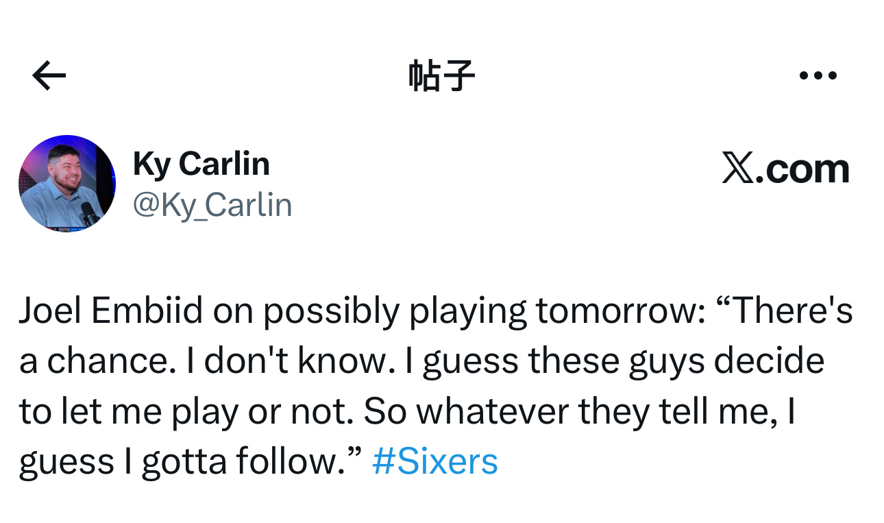 乔尔·恩比德赛后接受采访时,谈及明天背靠背上场的可能性——“有可能吧。我不知道,我想他们(球队)会决定让我上还是不让我上的。所以不管他们怎么说,我想我都得听他们的。”