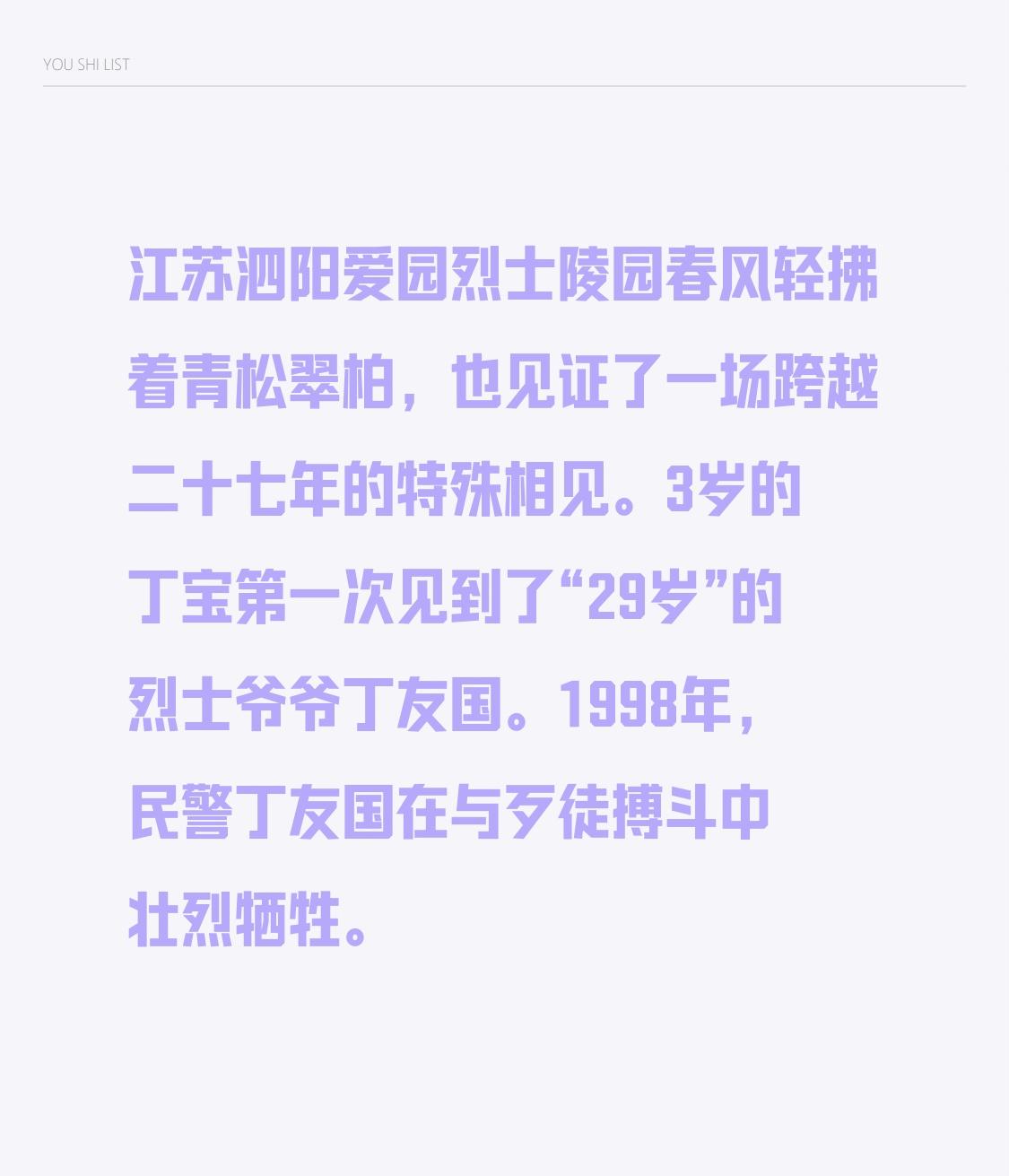 江苏泗阳爱园烈士陵园里,春风如同温柔的手轻抚着青松翠柏,它也像个默默的“吃瓜群众”,见证了一场跨越二十七年的特殊相见。3岁的丁宝,就像一颗刚破土的小嫩芽,第一次见到了“29岁”的烈士爷爷丁友国。1998年,民警丁友国在和歹徒搏斗时,像一位英勇无畏的超级英雄,壮烈牺牲。烈士公园扫墓