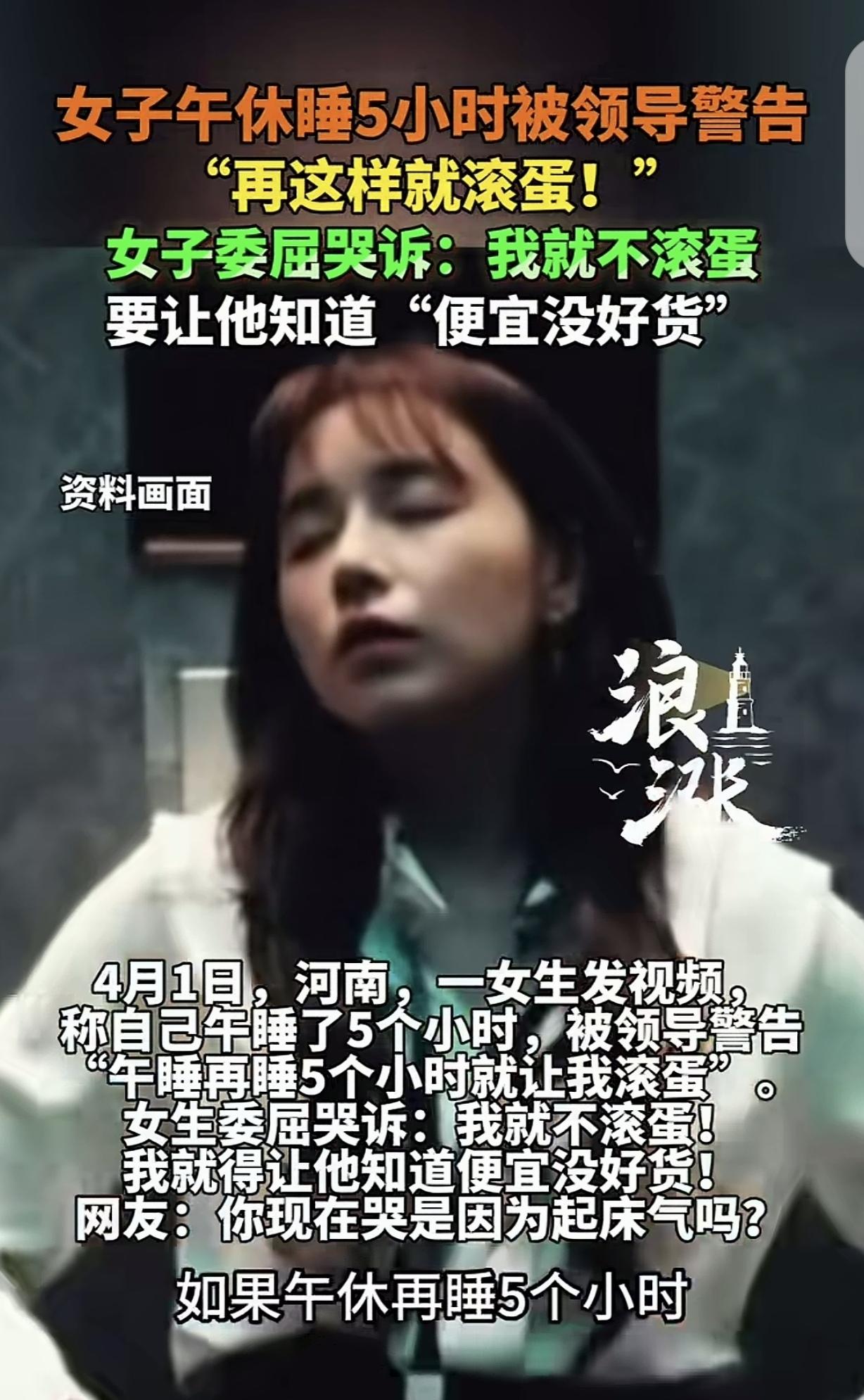 “憋不住笑!”河南,一女子午睡了5个小时,直接把领导给气炸了,呵斥她:再这样睡就滚蛋!可女子的反应让人笑喷,女子哭诉:我就不滚蛋,让他知道便宜没好货!网友:上班8小时,睡觉5小时,领导让你睡一下午觉,可没让你睡一下午觉。 一女子最近在网上出了名,起因就是一场睡过头的午觉。 女子在一家公司工作,平时上班忙得脚不沾地,连喝口水的功夫都没有。 那天上午,她刚处理完一波工作,忙的脚打后脑勺,累的精疲力竭。 到了午休时间,她连饭都没顾上吃几口,往工位上一靠就睡着了。 她本来定了20分钟的闹钟,可架不住身体太累,闹钟响的时候她迷迷糊糊按掉,想着再眯5分钟。 结果一睁眼,她整整睡了5个小时。要不是领导在她身后恶龙咆哮,她还不知道要睡多久。 女子瞬间慌了神,赶紧坐起来整理桌面,领导黑着脸站在她身后,对她怒目而视。 领导早上刚强调过,午休最多一小时,不能耽误手头工作,结果女子倒好,直接睡了一下午。 领导当场就炸了,当着办公室好几个人的面呵斥她,说她目无纪律,再这样就直接滚蛋。 换做别人,说不定早就低着头认错了,可女子是个直性子,被领导这么一说,委屈劲儿一下子上来了。 她本来就因为连续加班累得头晕,想着午休补个觉,没想到睡过头,自己也挺懊恼的,可领导的话也太难听了。 她红着眼眶跟领导解释,说自己这段时间天天加班到半夜,前一晚还处理了个难缠的客户到十一点,今天实在是撑不住才睡过了头。 事后,女子不服气,还委屈吧啦的发视频说,自己就不滚蛋,让领导知道“便宜没好货”。 女子言下之意就是她拿的工资不高,领导别指望她像个铁人一样连轴转。 这事儿看下来,领导和员工都有点各说各的理。领导气的是规矩被打破,他强调过午休时长,结果员工直接睡一下午,影响工作进度,换谁都得急。 可员工也委屈,连续加班累到睁不开眼,就想补个觉,睡过头也不是故意的,领导上来就说“滚蛋”,确实太伤人。 其实说白了,这就是职场里常见的“情理”和“规矩”的碰撞。 领导只看到员工违反纪律,却没注意到员工连轴转的疲惫。 员工觉得自己辛苦被无视,却也没考虑到睡一下午对工作的影响。 要是领导能先问问情况,员工醒了赶紧主动认错补工作,也不至于闹成这样。 调侃归调侃,也得给职场提个醒:公司不能光要求员工卖命,也得考虑员工的休息需求;员工守规矩的同时,也得有职场责任心,毕竟拿工资干活,该有的分寸得有。 《劳动法》第36条规定,国家实行劳动者每日工作时间不超过八小时、平均每周工作时间不超过四十四小时的工时制度。第四十一条规定,用人单位由于生产经营需要,经与工会和劳动者协商后可以延长工作时间。 如果员工所述连续加班情况属实,公司可能存在违法延长工作时间的问题。 但员工午休超时违反公司制度,公司可依规处理,却无权直接辞退。 对此,你怎么看?