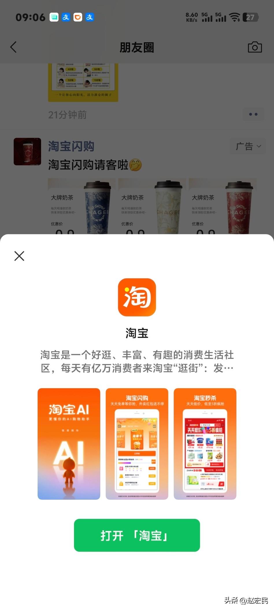 刚刚在微信朋友圈看到淘宝闪购的广告,看着还不错,直接点开了,没想到出现一个按钮「打开淘宝」,点了一下,居然直接跳转到淘宝了。上一次能直接这么跳转,应该还是十多年前吧