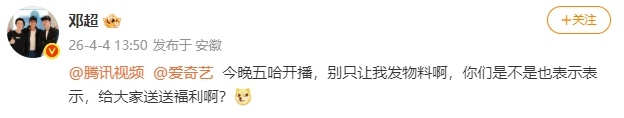邓超五哈福利官邓超老辈子就是会疼人 邓超真的太懂观众了!五哈开播,他不光自己给大家送物料,还主动帮大家向平台争取福利,完全是观众的嘴替,老辈子就是会疼人,这波操作直接把期待值拉满,今晚的五哈必须追起来!(cr:网络)邓超