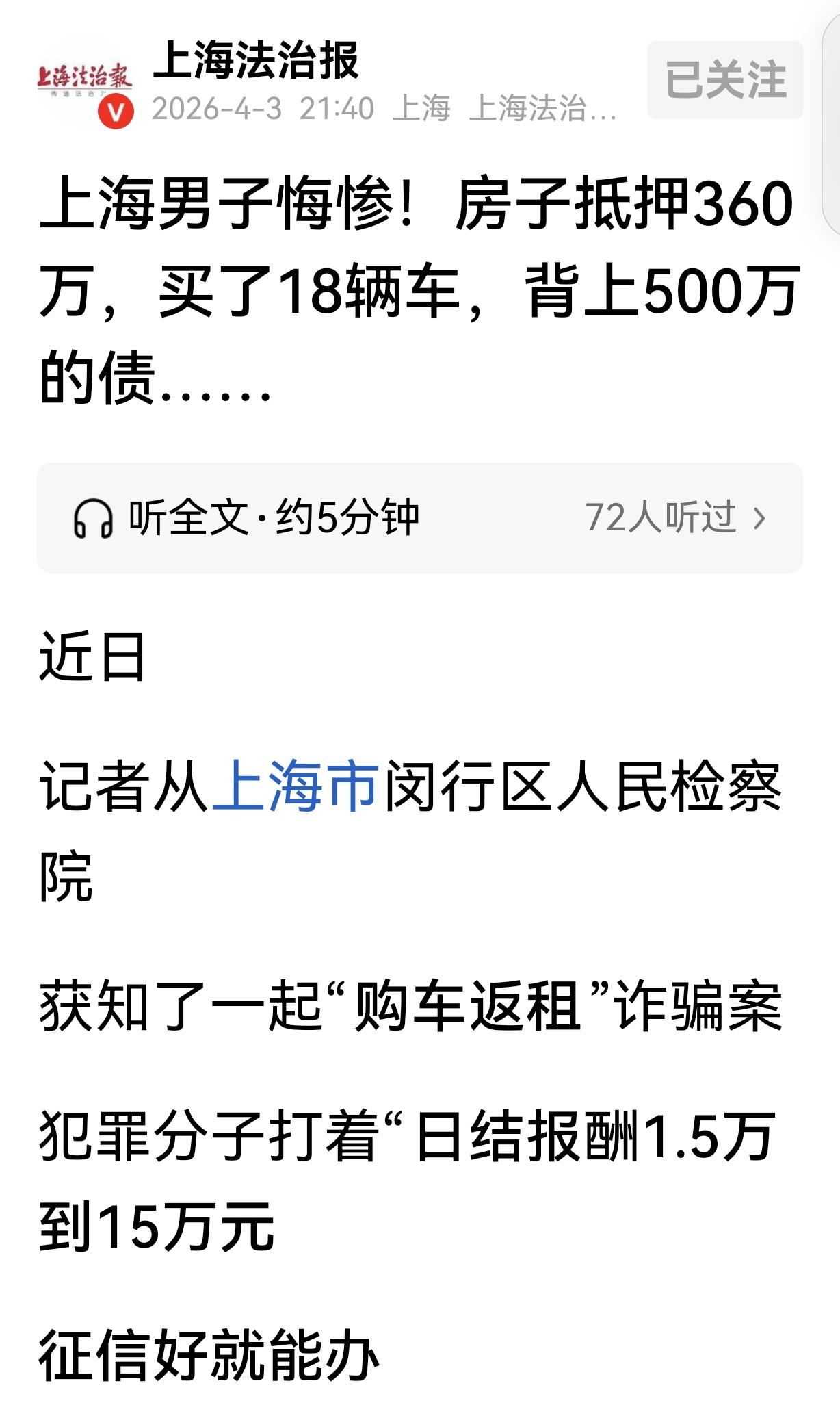 “贪小便宜吃大亏!”上海,一男子想挣钱想疯了,他看见一公司宣传,只要从公司“贷款买车”,把车再租给公司,他就日入过万,所有月供由公司偿还,男子一下子动心了,他贷款55万,当天就挣了60000元“残值费”,他顿时心花怒放,又把房子抵押360万,买了18辆车,一下子到手了40万。正在他做发财梦时,万万没想到,事情急转直下,最后竟背上500万的债,男子崩溃了。 张先生觉得人没外财不富,马无夜草不肥,他做梦都想挣点外快。 那天,他刷兼职群,看到有人发消息说,只要帮忙贷款买车,不仅不用自己还月供,还能一次性拿好几万报酬。 张先生本来就挣钱心切,一看这条件,心思立刻活络了。 他联系上发布人,很快被拉进一个群,里面的客服给他详细讲了所谓的“购车返租”模式。 其实就是用张先生的名义,贷款买本公司的车,然后把车租给公司,公司负责还贷款,还给他一笔“车辆残值费”,相当于借他的名,他每月白拿钱。 张先生心想,不管做不做,先了解一下没毛病,否则错过机会,也就失去了生财之道了。 对方一看张先生征信没污点,社保按时缴,说他资质完全没问题,约他去公司敲定。 张先生喜不自禁,就好像自己离日进斗金,财务自由不远了,如果这样,以后就能躺平了,还干什么朝九晚五的工作呀,那不是没苦硬吃吗? 公司告诉张先生,他如果想加入,有2个选择:要么每月拿点公司的利润,5年后,他把旧车开回家。 要么,他每辆车直接拿1.5-2.3万的残值费,不用管车。 张先生毫不犹豫选了后者,毕竟眼前的钱最实在。 接下来,张先生就上道了,贷款55万,然后把钱打给那家公司,他一下子拿到6万块现金。 看着手机里到账的提醒,张先生觉得发财的机会来了。 之后的几个月,张先生按捺不住自己了,觉得得加大投资,否则这点钱就是小打小闹,挣不了大钱,只能解决温饱,舍不住孩子套不住狼。 随后,张先生不断往里投钱,陆陆续续挣了40万,他的胃口越来越大,欲望越来越膨胀。 公司也怂恿他,说买10辆车以上收益更高,机不可失,失不再来,过了这村没这店了。 张先生彻底被冲昏了头,竟然把自己的房子抵押了360万,一口气买了18辆车,就等着拿更多的钱。 可没高兴多久,2024年9月,张先生突然发现银行发来逾期提醒,说车贷没还。 他赶紧联系公司,却发现之前对接的人全失联了,公司也空了。 直到这时,他才明白自己掉进了骗局里,那近500万的贷款,全得他自己还。 张先生报了警,警方一查才发现,这是个包括他在内,有220多人受害者的大骗局。 最后,法院判这家公司犯集资诈骗罪,老板被判了9年,几个手下也都获了刑。 可张先生的500万债务却实打实落在了自己身上,好好的日子,就因为贪那点小便宜,彻底毁了。 《刑法》第192条规定,以非法占有为目的,使用诈骗方法非法集资,数额巨大或者有其他严重情节的,处七年以上有期徒刑或者无期徒刑,并处罚金或者没收财产。 具体到本案,公司以“购车返租、代为还月供”为幌子,通过虚假承诺高额回报,诱骗张先生等220余人贷款,涉案金额达9700余万元,已构成集资诈骗罪。 张先生因贪利陷入骗局,虽然自身受害,但贷款仍需自行偿还,他的遭遇也警示大家:“天上掉馅饼”往往是陷阱。 对此,你怎么看?
