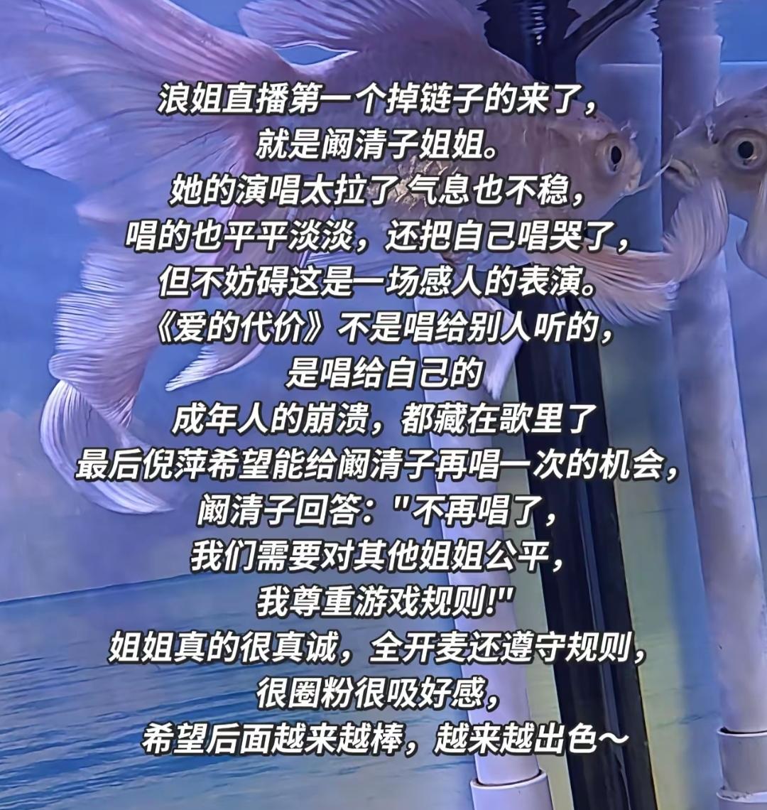 她猜到了这个结局,开场就不能控制自己的情绪,气息不稳,跑调,但却被所有人原谅。倪萍老师建议重新给一次机会,她不假思索的说,尊重游戏规则! 《爱的代价》,阚清子是唱给自己听吧,她的那个宝宝,应该是不幸的没有了,这对于任何一个妈妈来说都是重创。阚清子想通过舞台证明自己可以重生,但是结果似乎不如意。但是无论怎么样,她踏出这一步,就表示,离走出来不远了。