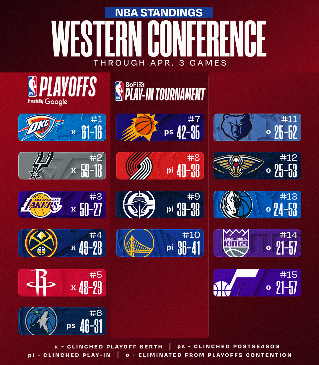 东西部目前排名和对阵情况,当前湖人首轮🆚森林狼季后赛将在北京时间4月19日正式