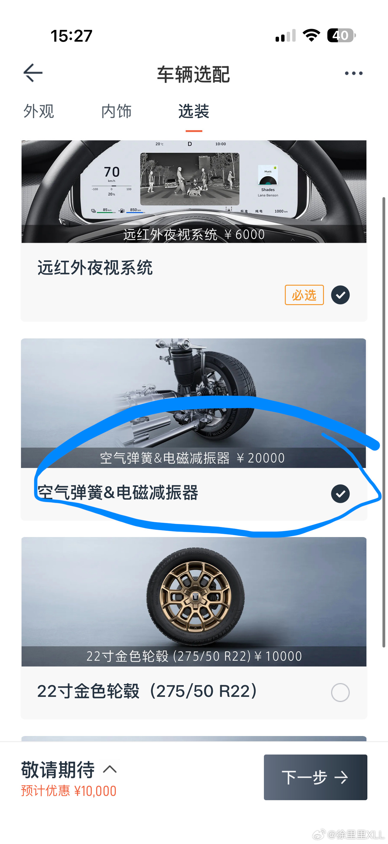 标配了,万一用户开出去玩,有可能会对用户的人身财产安全造成不可预料的损失。谷总也一直鼓励大家最好是不要选空簧,螺旋弹簧的行驶品质也足够好了,而且还更稳定耐用。