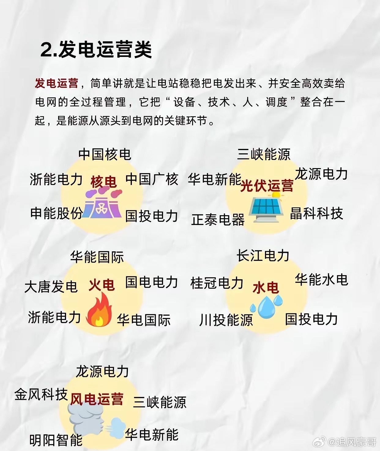 电力板块细分领域龙头梳理一、电力设备类定义:电力设备是电力系统中电能生产、传输、分配、转换、控制及保护全环节的核心硬件载体,是保障电能从生产端到消费端安全、稳定、高效流转的关键支撑。- 特高压设备:国电南瑞、中国西电、特变电工、许继电气、平高电气- 变压器:特变电工、保变电气、金盘科技、中国西电、许继电气- 发电设备:东方电气、哈尔滨电气、上海电气、明阳智能、金风科技- 电力线缆:亨通光电、汉缆股份、东方电缆、通达股份、中天科技二、发电运营类定义:发电运营是对电站发电全流程(从电能生产到安全并入电网)的系统性管理,通过整合“设备、技术、人力、调度”四大要素,实现能源从源头到电网的高效转化与输送,是能源供应链的核心枢纽。- 核电:中国核电、浙能电力、中国广核、申能股份、国投电力- 光伏运营:三峡能源、华电新能、龙源电力、正泰电器、晶科科技- 火电:华能国际、大唐发电、国电电力、浙能电力、华电国际- 水电:长江电力、桂冠电力、川投能源、华能水电、国投电力- 风电运营:龙源电力、金风科技、三峡能源、明阳智能、华电新能三、电力服务与配套类定义:电力服务与配套是电网安全、稳定、高效运行的“隐形支撑体系”,通过调频、调压、备用等核心服务,确保电力系统精准响应终端能源需求,为千万家庭与企业用电“保驾护航”。- 储能:南网储能、宁德时代、派能科技、阳光电源、国电南瑞- 电网自动化与信息化:国电南瑞、四方股份、许继电气、南网科技、长园集团- 电力工程与设计:中国电建、上海电力、内蒙华电、中国能建、粤电力A