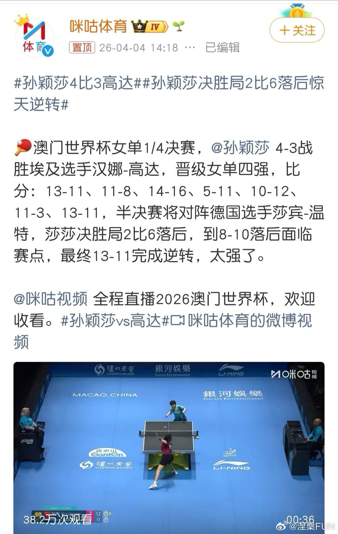 孙颖莎4比3高达 祝贺莎莎,赢了对手,晋级比赛!就是对手这个名字高达,听着都点变