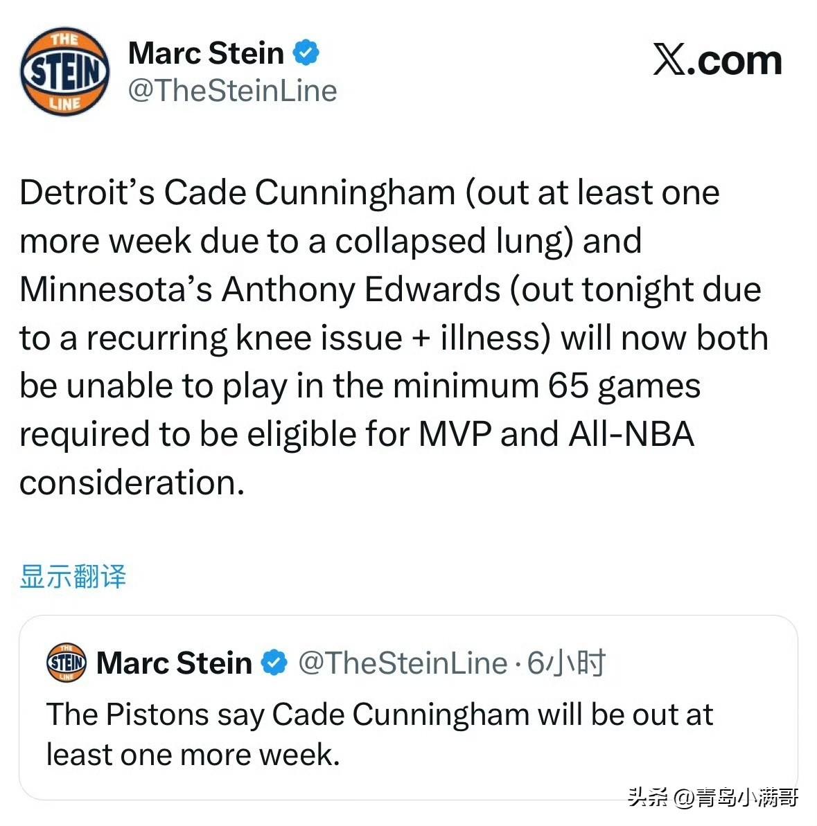 森林狼当家球星爱德华兹和活塞当家球星坎宁安很遗憾都将无缘本赛季末各大奖项的评选,因为他们的出战都不足64场,所以按照联盟规定,他们只能和这些奖项说拜拜了!