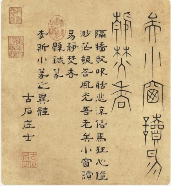 懸鍼篆 韋齋朱先生詩《燈夕在試院用舊韻》。(隸書):隔牆歌頌聒悲涼,信馬狂心墮渺茫。報答風光吾老矣,小窗讀易靜焚香。(篆書):隔牆歌頌聒悲涼,信馬狂心墮渺茫。報答風光吾老矣,小窗讀易靜焚香。懸鍼篆,李斯小篆之異體。古石居士。(隸書)