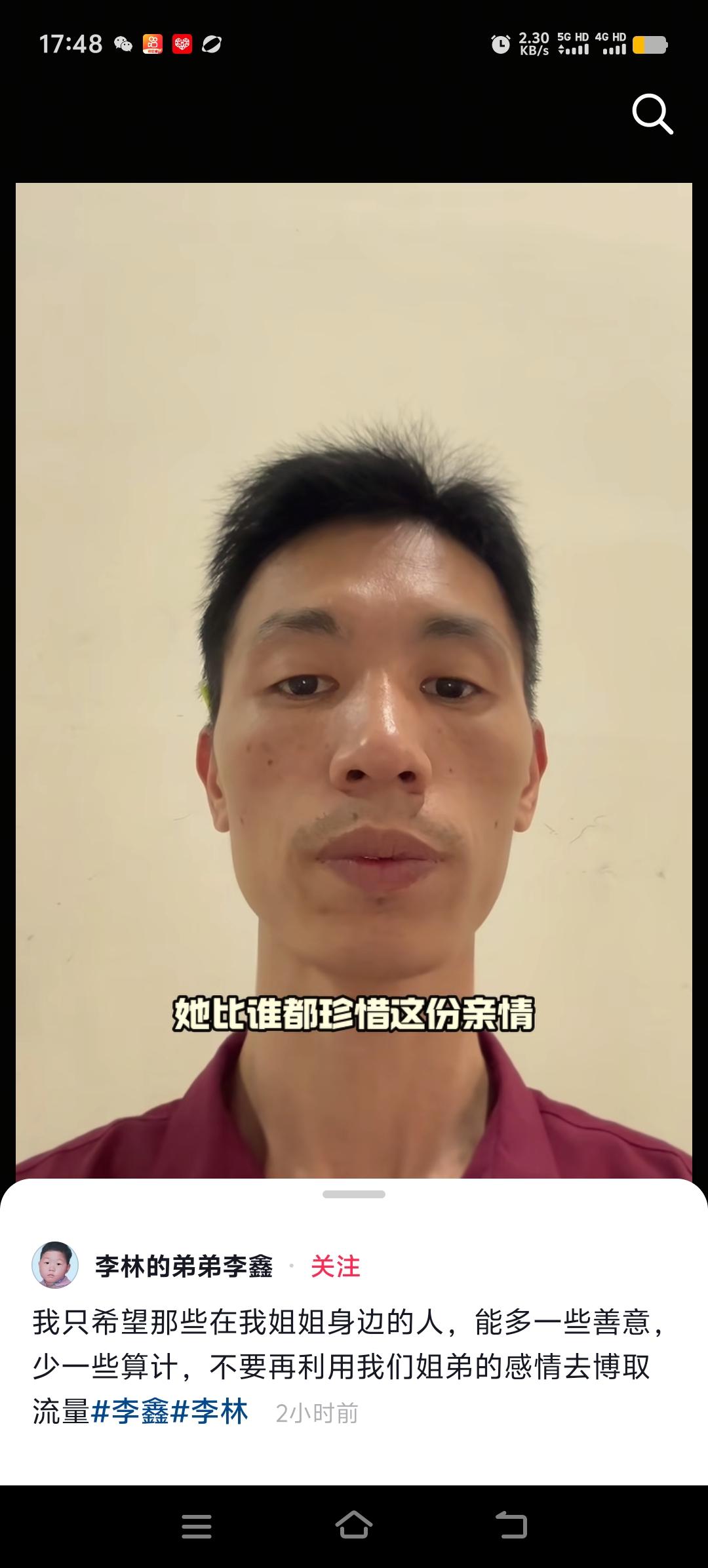 李鑫的姐姐发布了两个视频,似乎是称有大量水军涌入她的评论区,要求她闭嘴。李鑫发布视频表示自己已经长大,有了自己的想法和主见。似乎李林没能理解李鑫的意思?也有粉丝称李林要走雷公路线,觉得弟弟找到了就好,毕竟他已不是十几岁的少年,也并非未婚,还有回归的可能,只要他知道自己的根在哪里就行,不必非得强调他姓李而非姓韩。