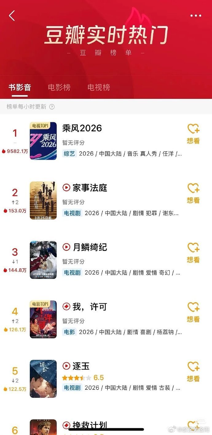 乘风2026第一从云合到豆瓣再到微博,全平台第一,乘风 2026 实火!乘风2026