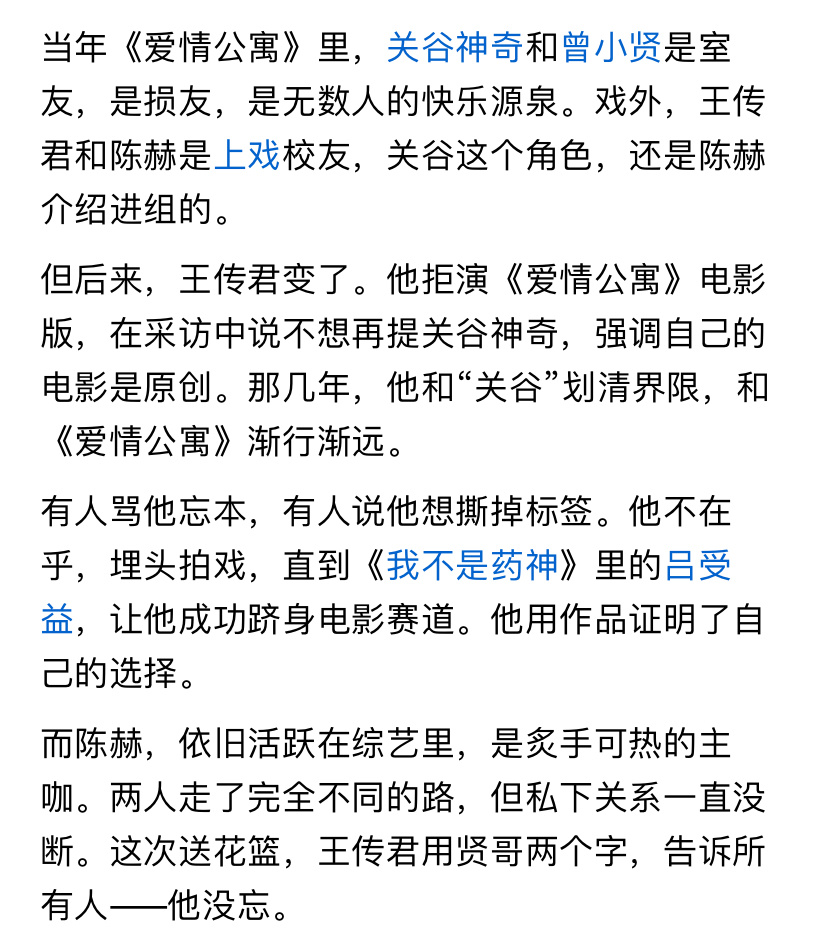王传君,终于回头了!一张花篮照片让无数《爱情公寓》老粉破防。陈赫新话剧首演,王传君送来的花篮上,写着——贤哥。
